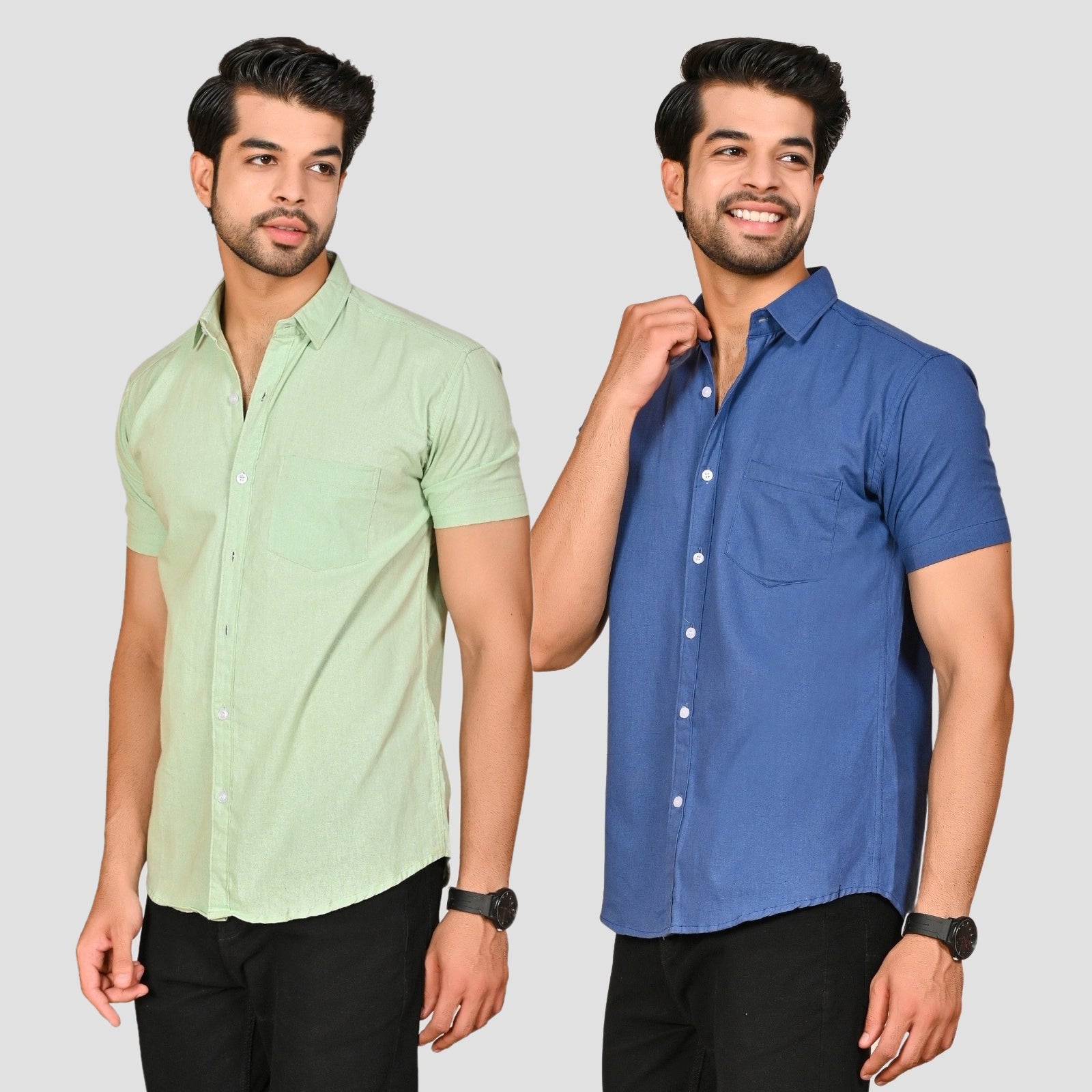 Green And Teal Blue Half Sleeve Linen Shirt Combo