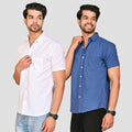 White And Teal Blue Half Sleeve Linen Shirt Combo