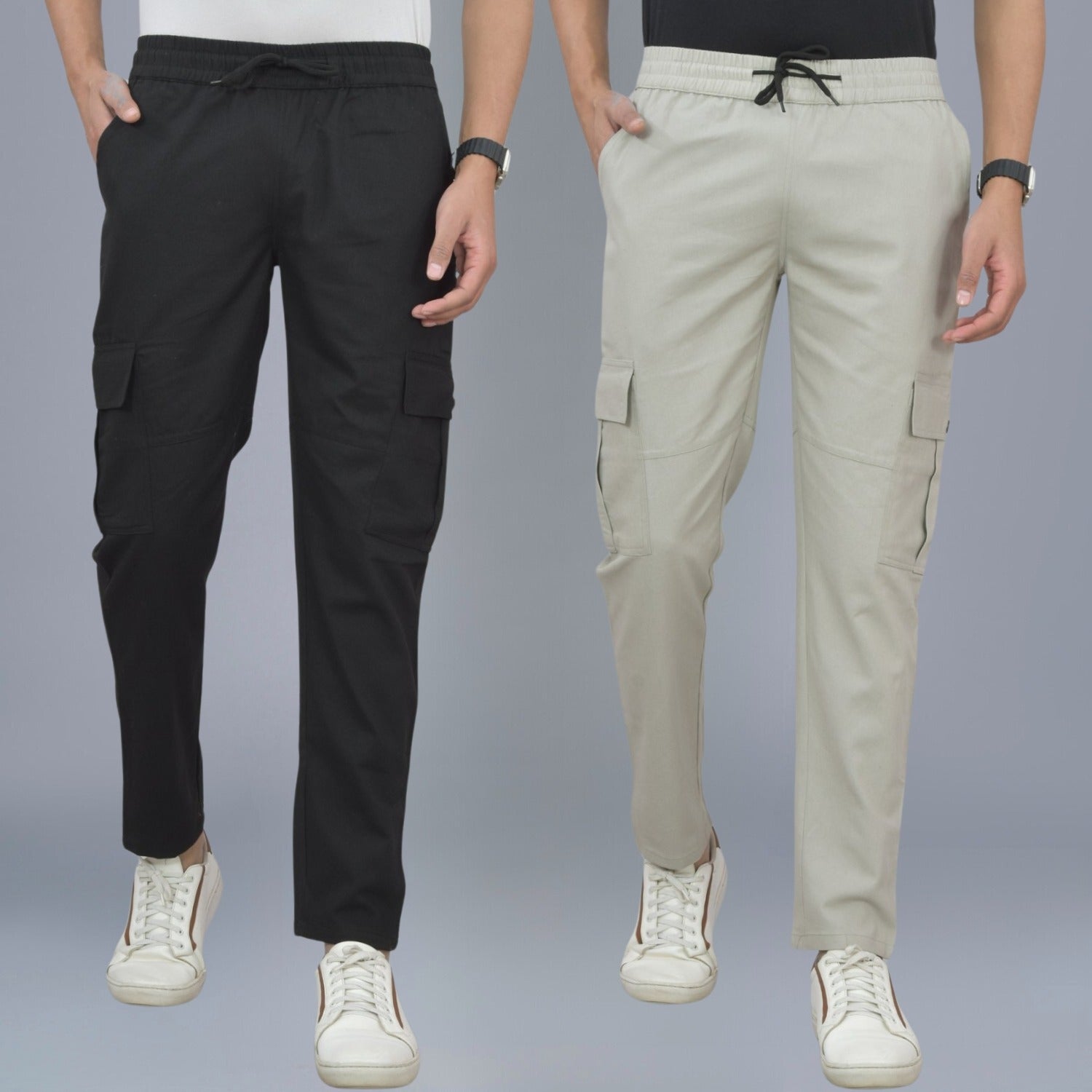Pack Of 2 Mens Black And Melange Grey Twill Straight Cargo Pants Combo