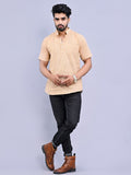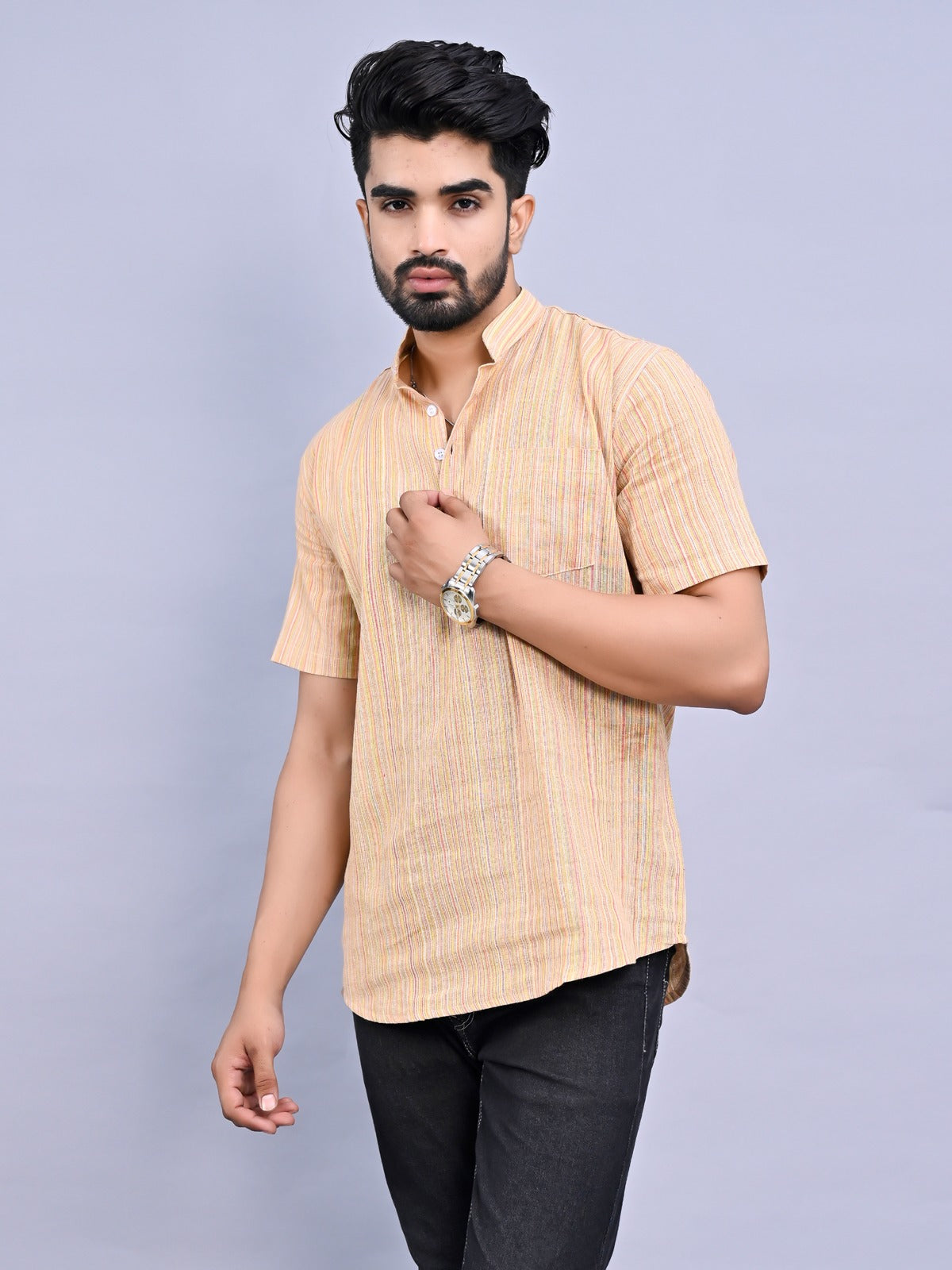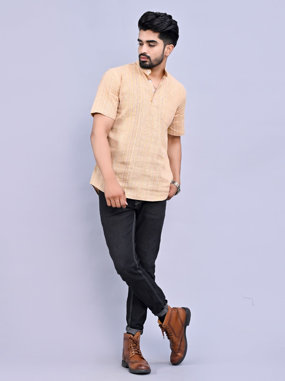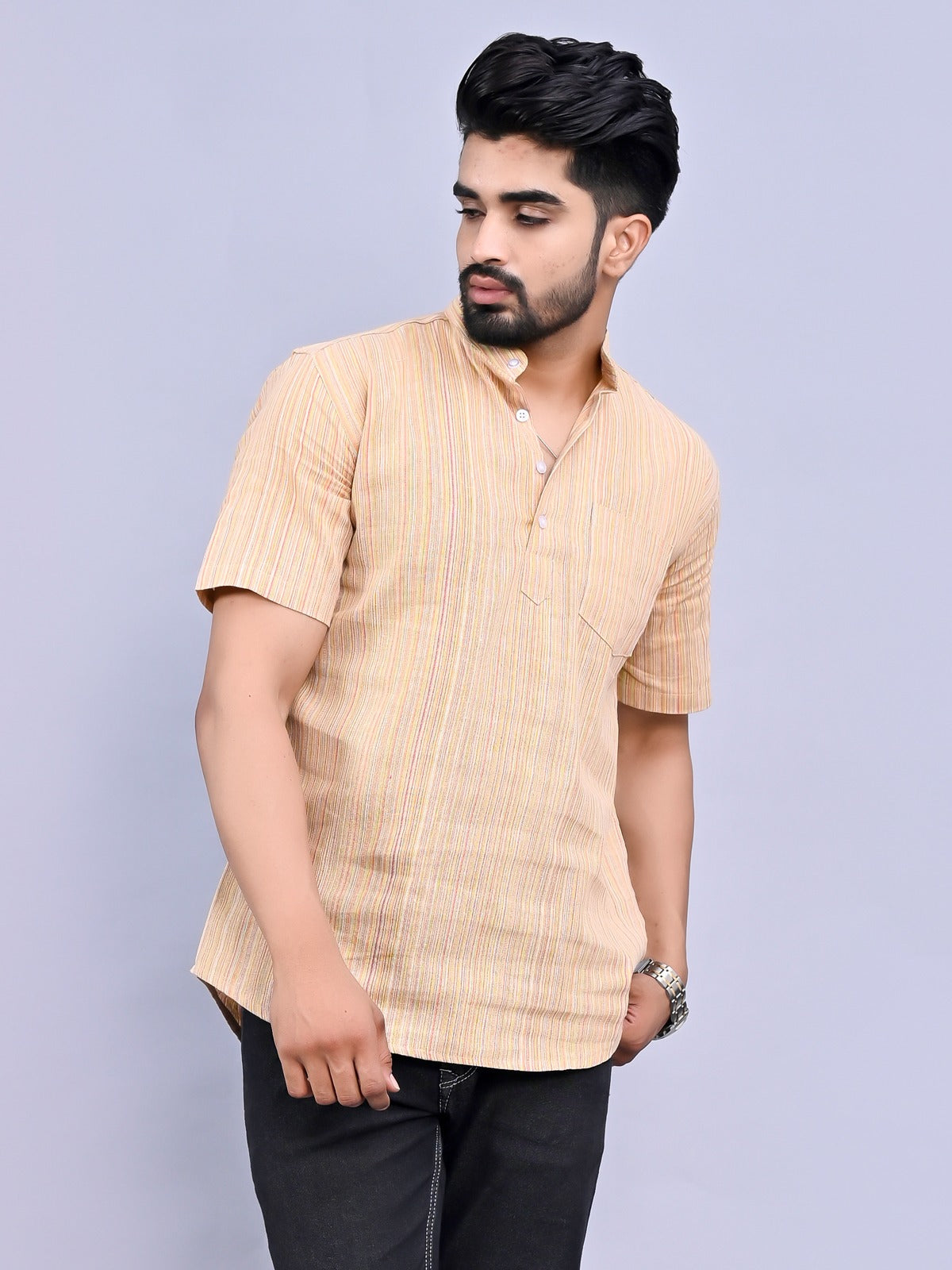 Regular Fit Brown Multi Stripes Cotton Short Kurta