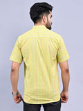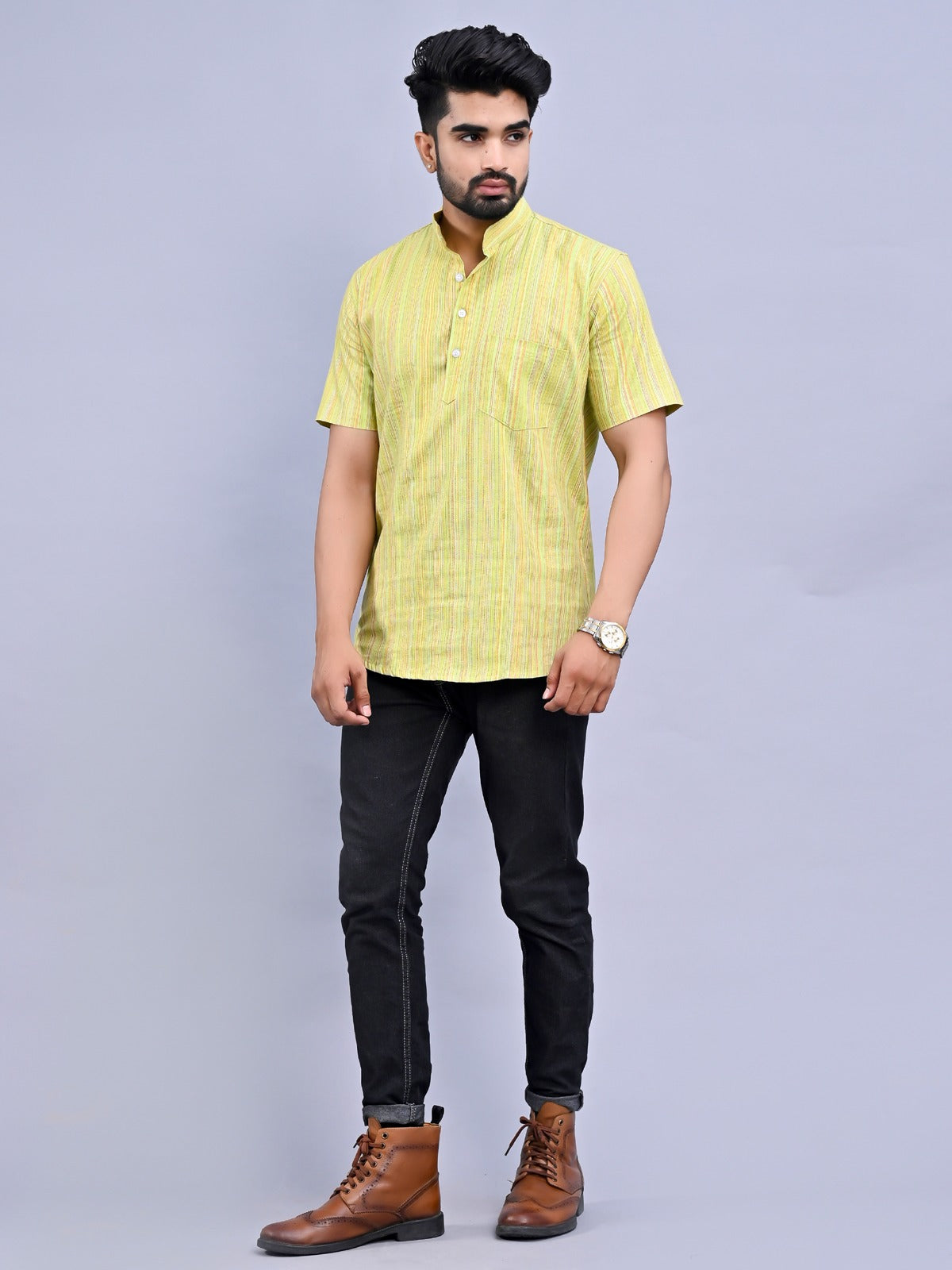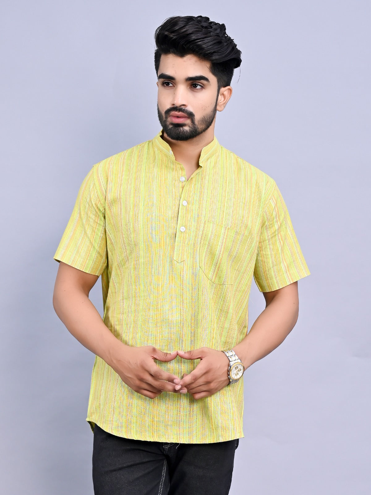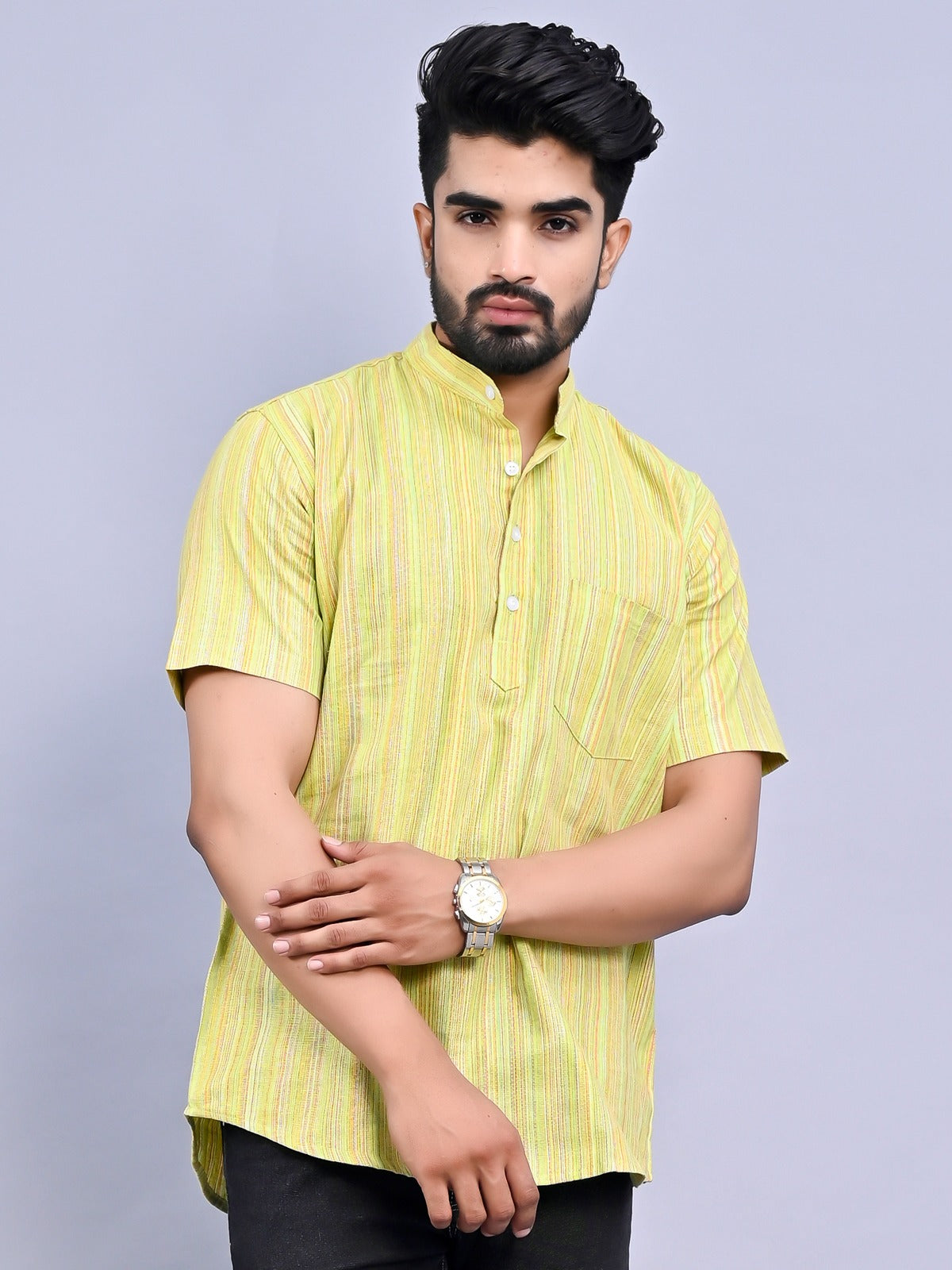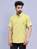 Regular Fit Green Multi Stripes Cotton Short Kurta