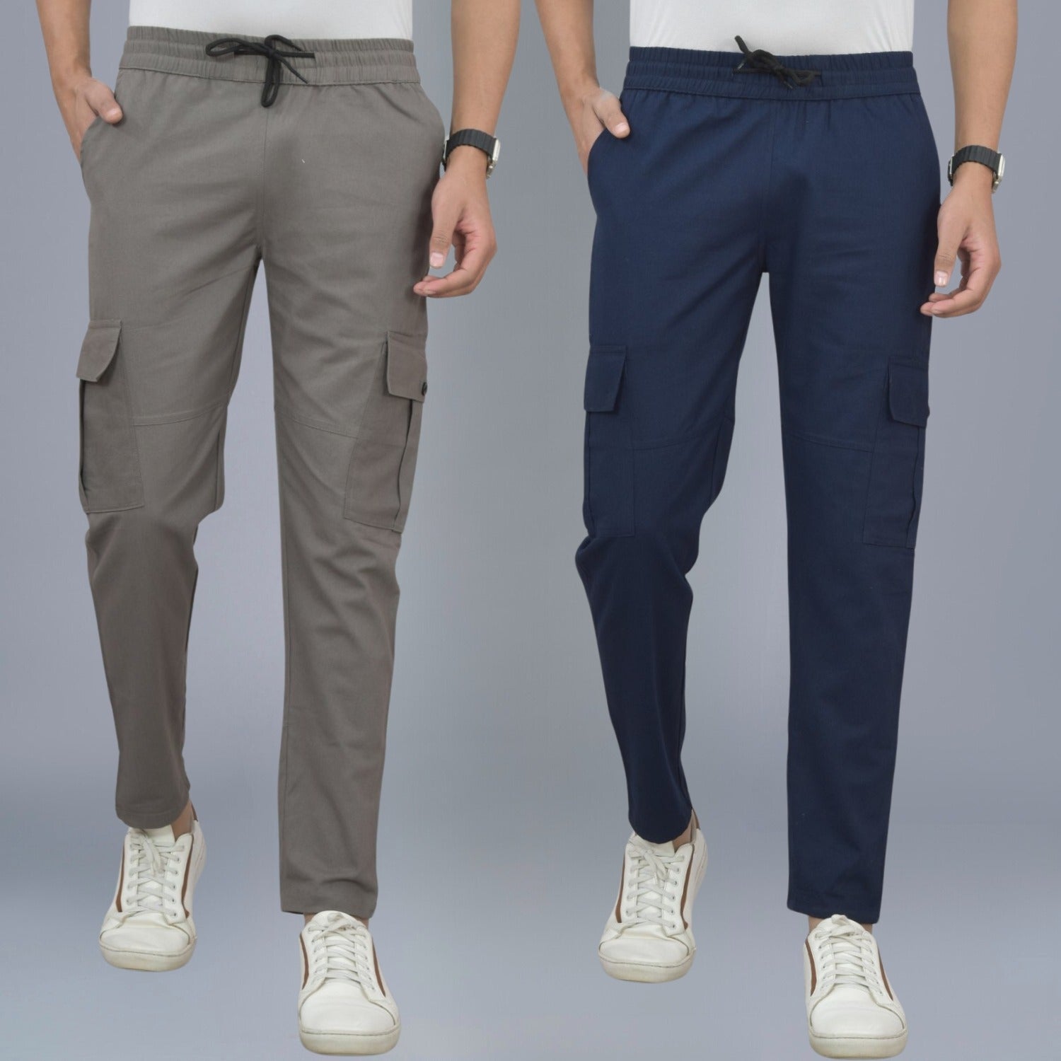 Pack Of 2 Mens Grey And Navy Blue Twill Straight Cargo Pants Combo