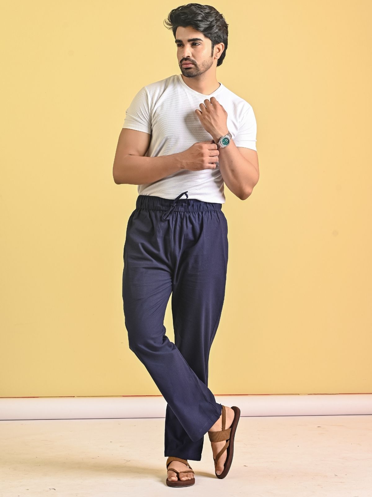 Designed for all-day comfort and relaxation, our men's loose-fitting pajama pants are a great way to upgrade your sleepwear. These full-length pajama pants, which are made of a soft and breathable cotton blend, are ideal for sleeping or relaxing. With an adjustable drawstring and a fully elasticated waistband, they provide a snug yet adaptable fit. With two side pockets and a patch pocket on the back hip, this practical yet comfortable bag is perfect for holding small necessities close at hand. These cotton-blend pajama pants offer the ideal balance of ease, style, and durability, whether you're sleeping through the night or having a relaxing weekend morning. A wardrobe essential for all men.