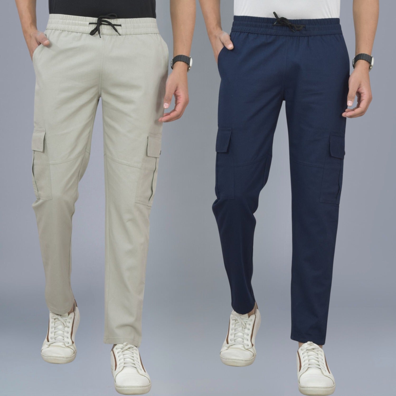 Pack Of 2 Mens Melange Grey And Navy Blue Twill Straight Cargo Pants Combo