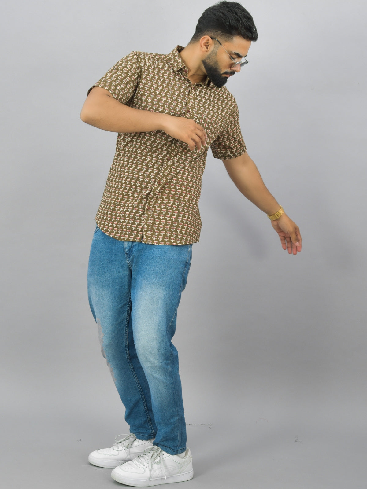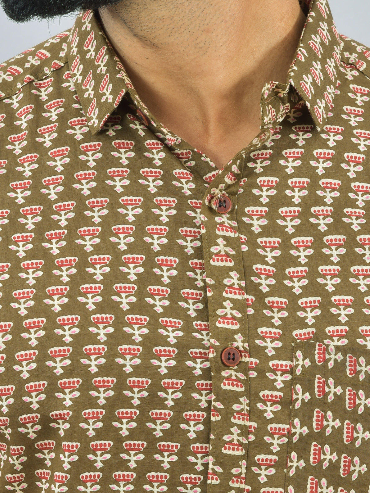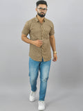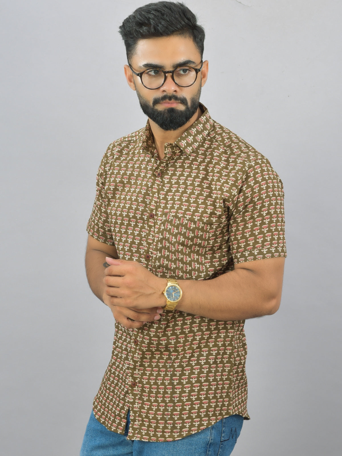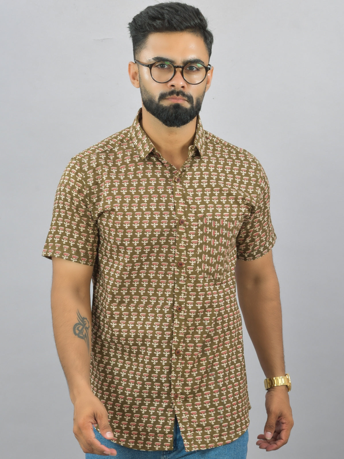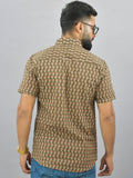 Mens Regualr Fit Half Sleeves Mehndi Green Floral Printed Cotton Shirt