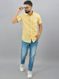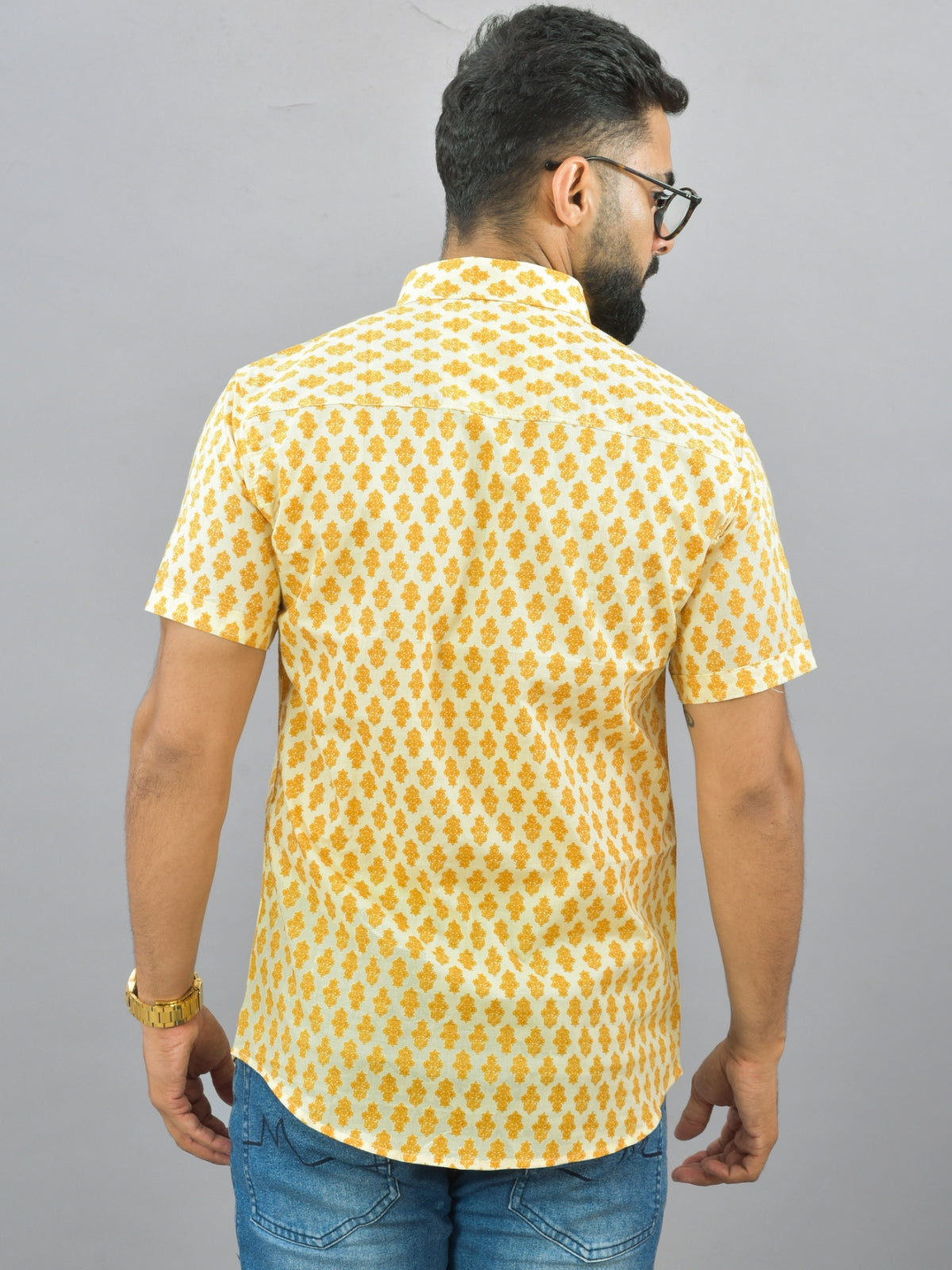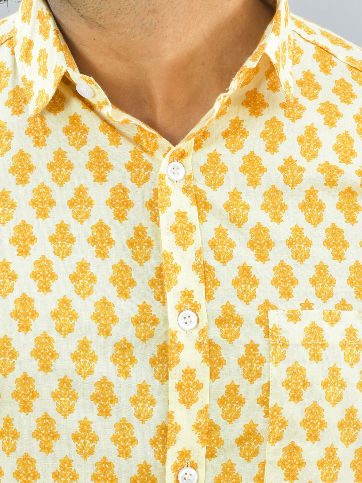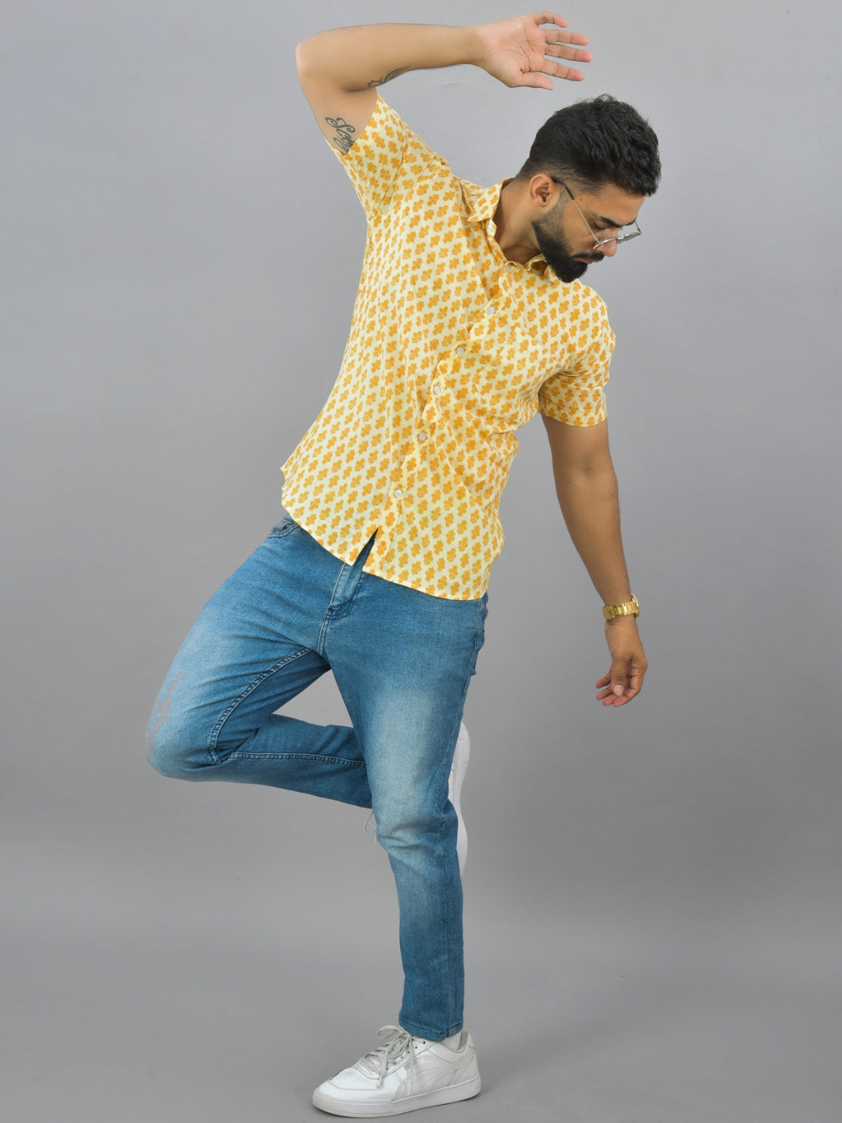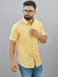 Mens Regualr Fit Half Sleeves Mustard Floral Printed Cotton Shirt