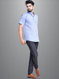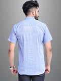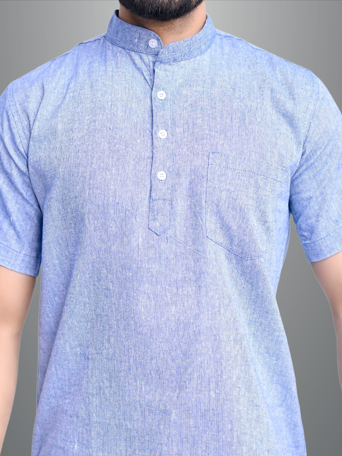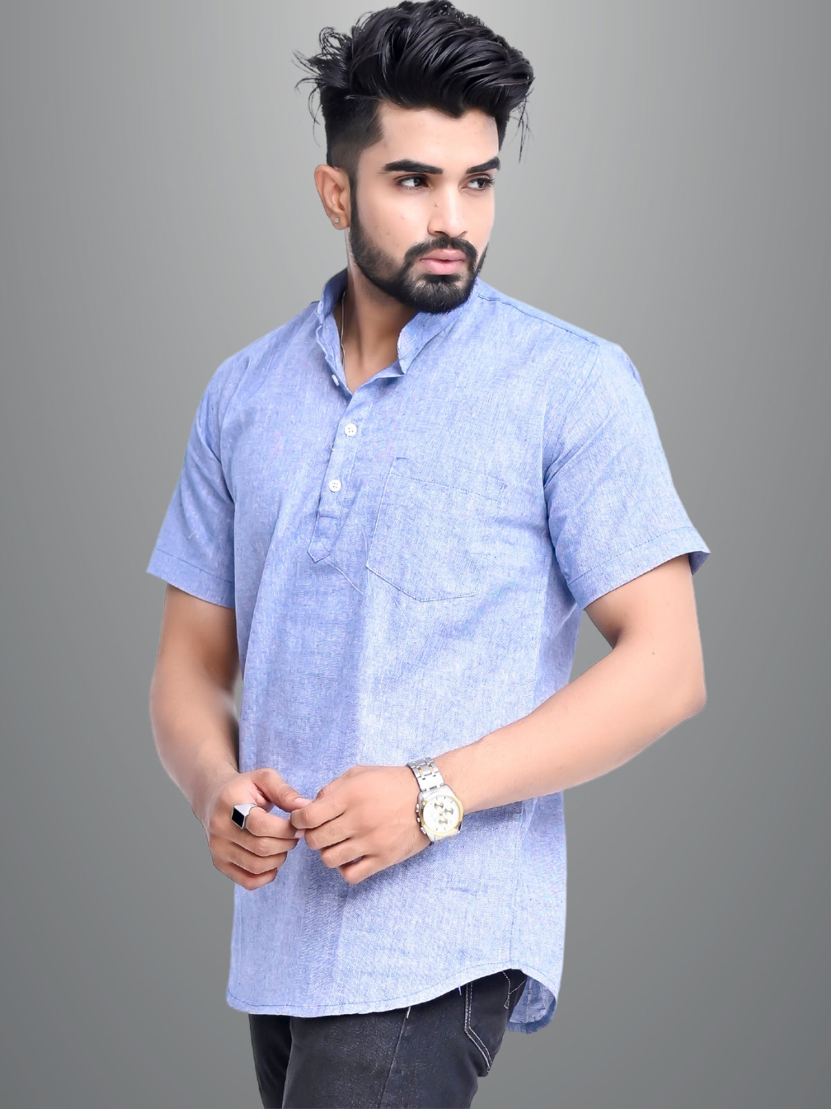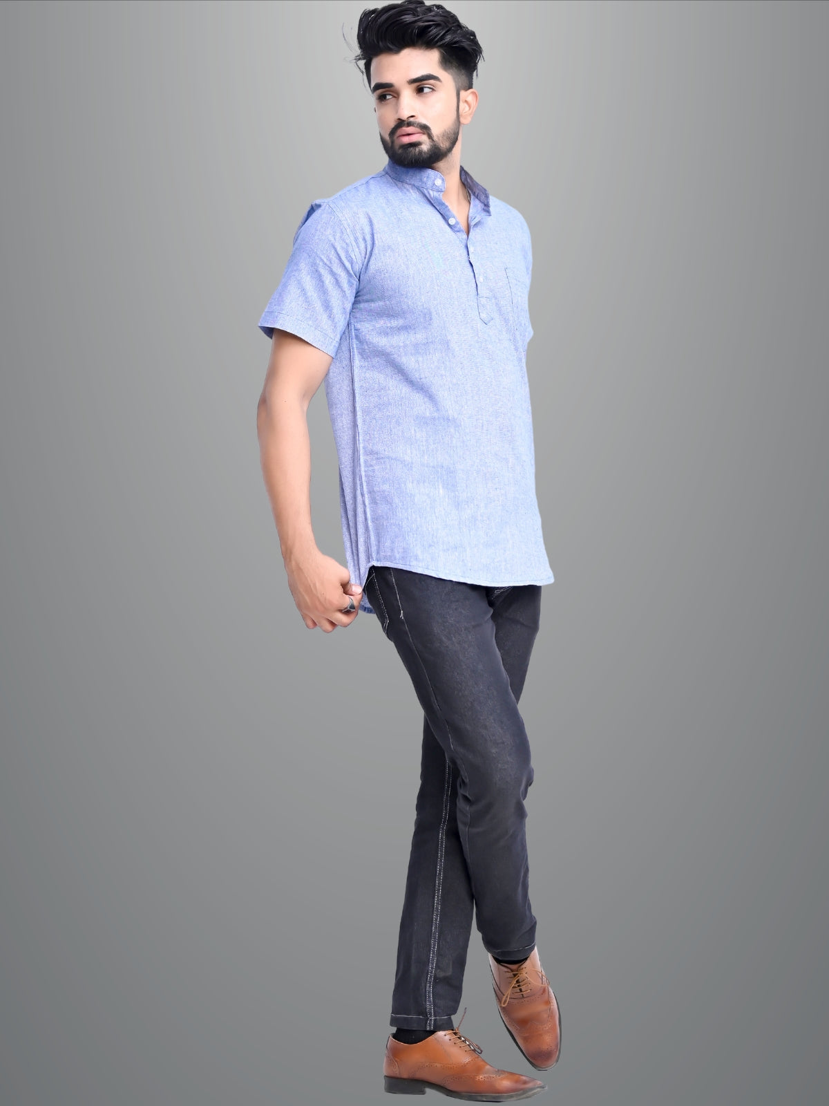 Mens Solid Light Blue Khadi Cotton Short Kurta