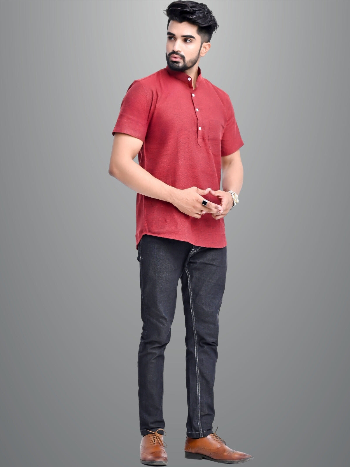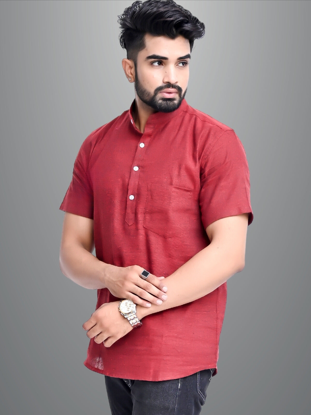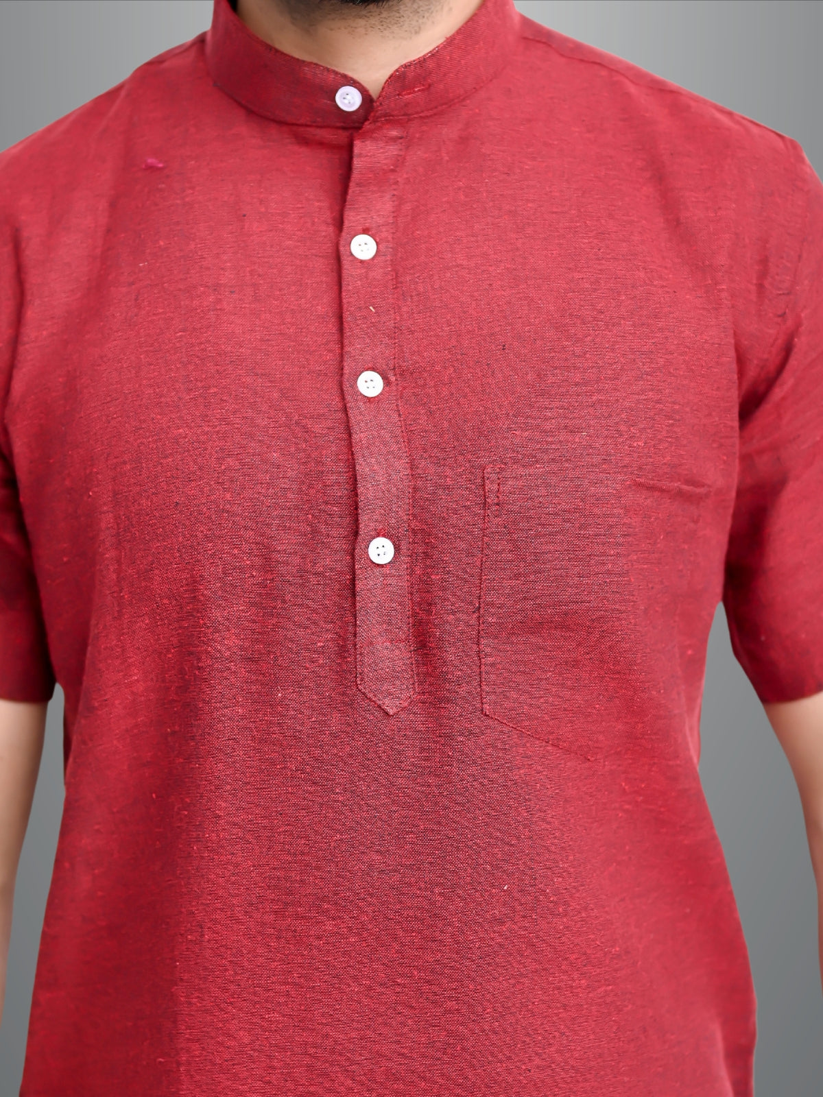 Mens Solid Maroon Khadi Cotton Short Kurta