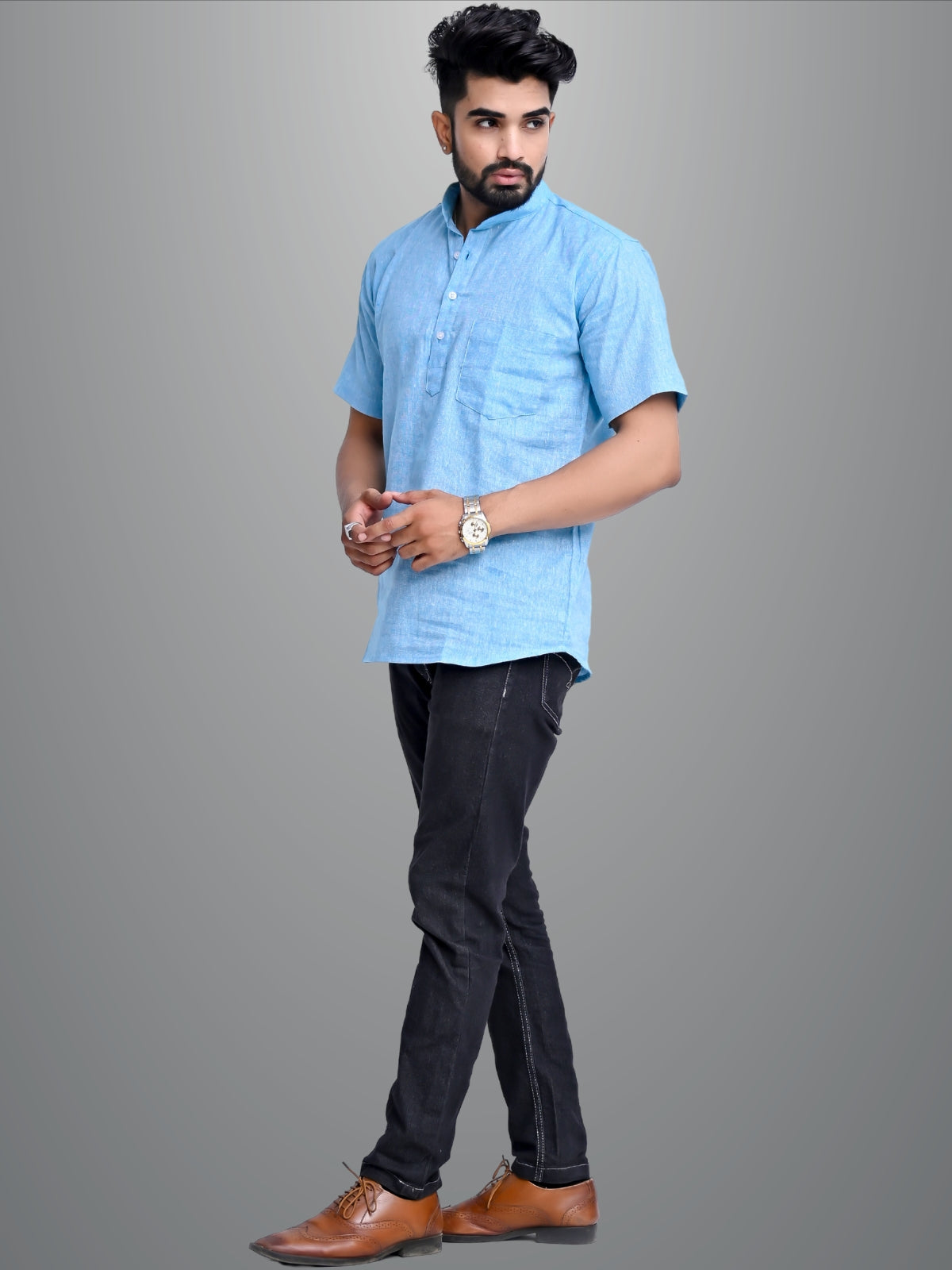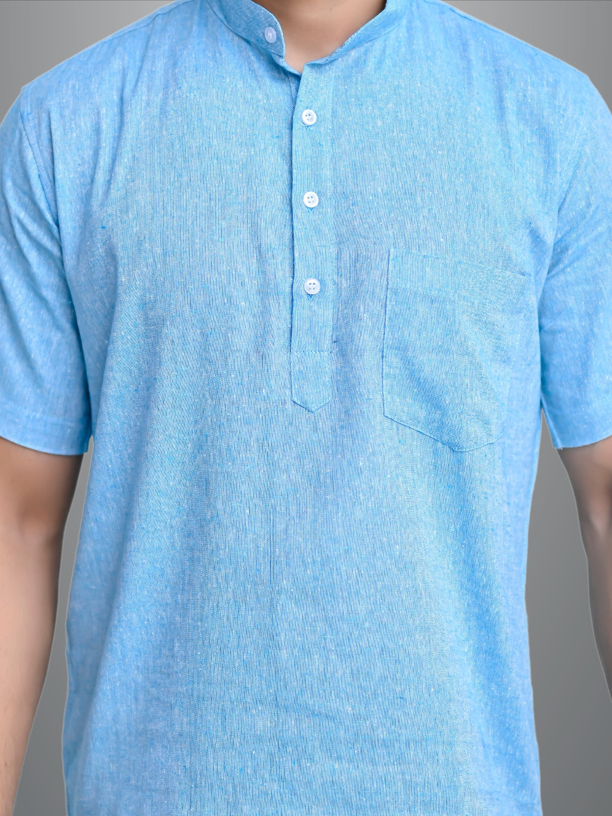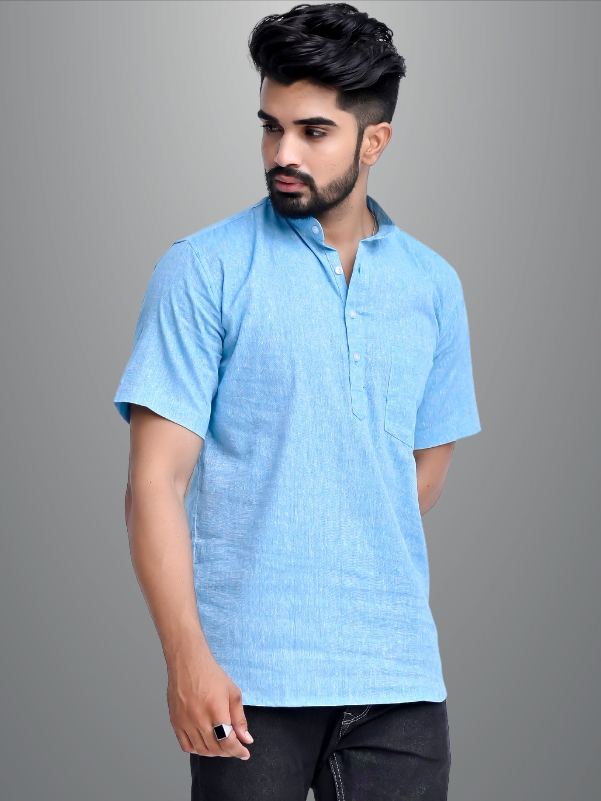Mens Solid Sky Blue Khadi Cotton Short Kurta