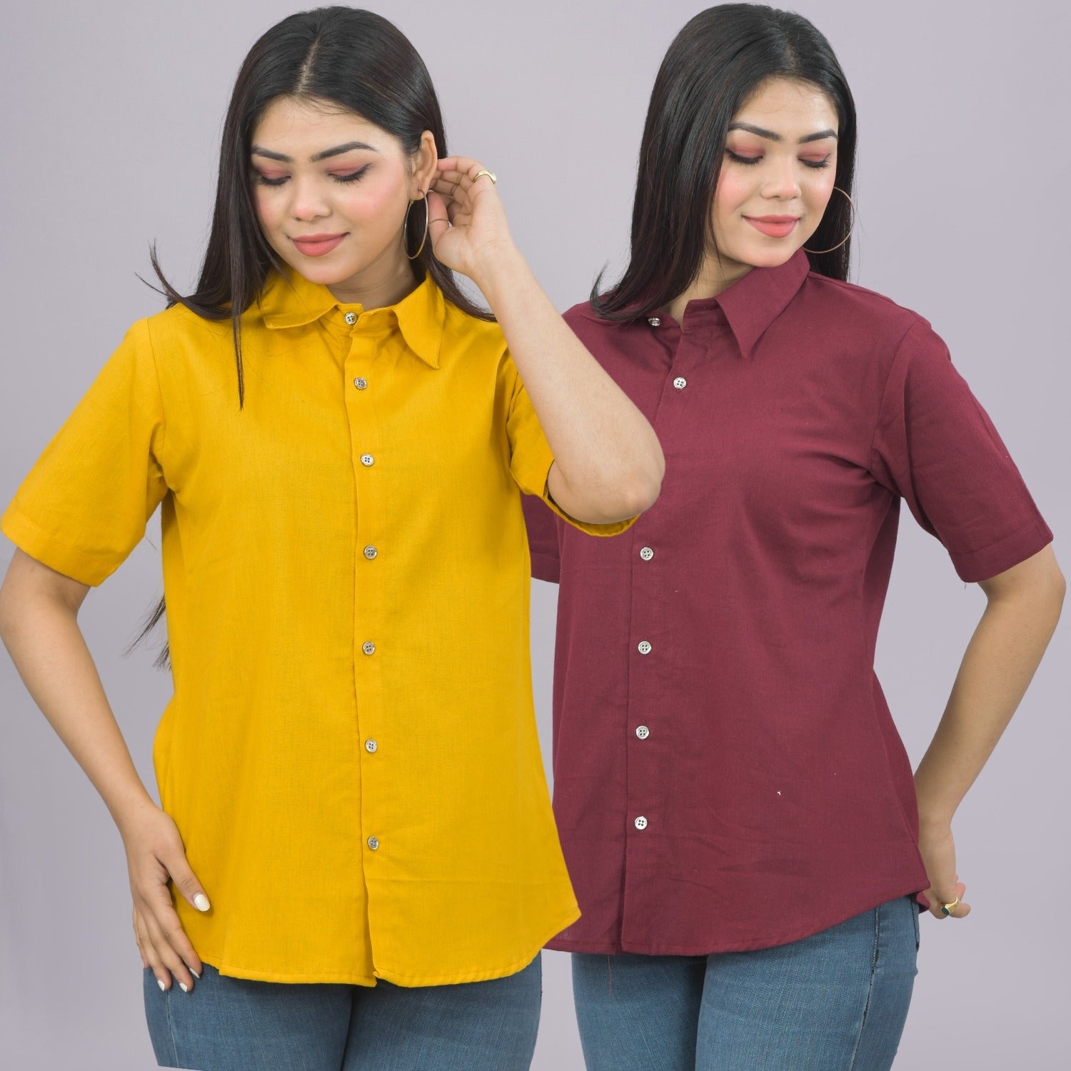 Pack Of 2 Womens Solid Mustard And Wine Half Sleeve Cotton Shirts Combo