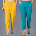 Pack Of 2 Womens Regular Fit Mustard And Cyan Fully Elastic Waistband Cotton Trouser