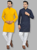 Mens Solid Mustard And Navy Blue Cotton Long Kurta Combo