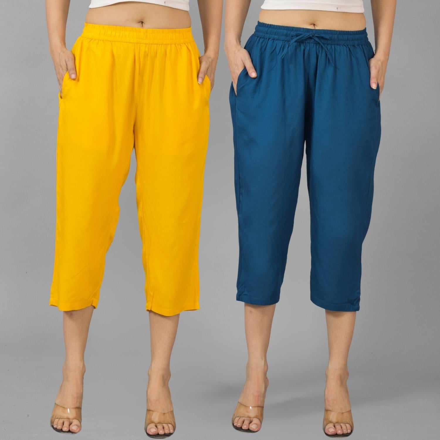 Pack Of 2 Womens Mustard And Teal Blue Calf Length Rayon Culottes Trouser Combo