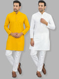 Mens Solid Mustard And White Cotton Long Kurta Combo