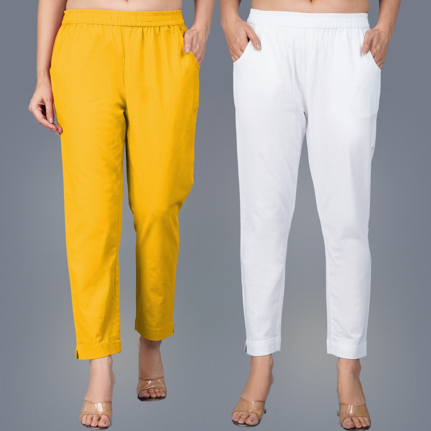 Pack Of 2 Womens Regular Fit Mustard And White Fully Elastic Waistband Cotton Trouser