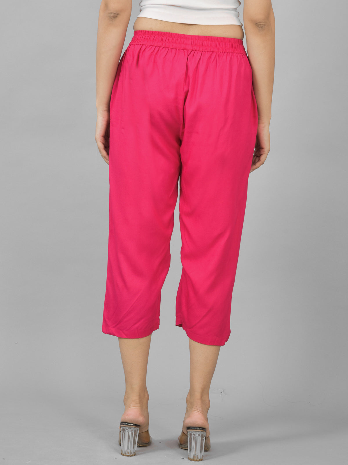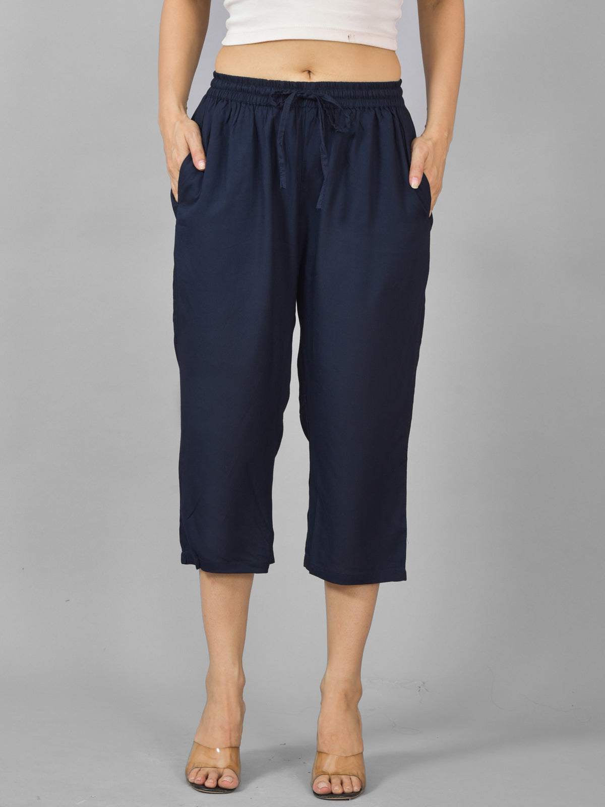 These Pack Of 2 Women's Rayon Calf Length Culottes Trousers Combo from Quaclo will Increase your level of style. These pair of adaptable culottes effortlessly combines comfort and style, making them the ideal choice for any situation. With a convenient Fully elastic and On Front Drawing string. The two spacious pockets improve functionality and convenience for your daily activities, and the solid design makes these trousers a long-lasting classic in your wardrobe.