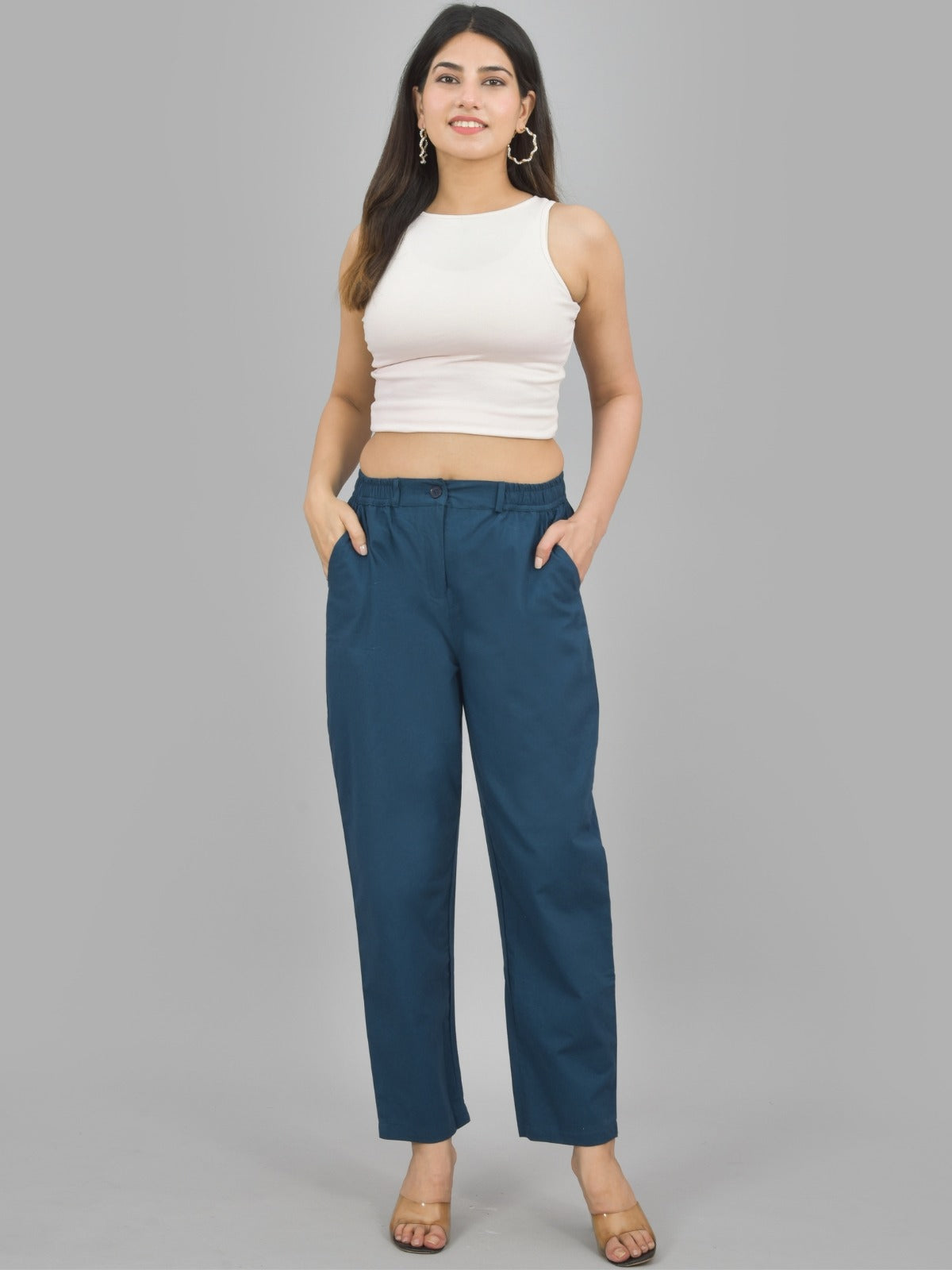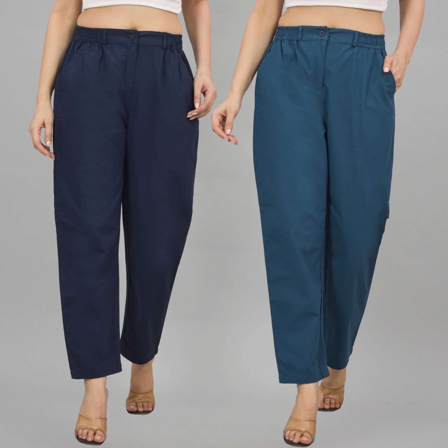 Combo Pack Of 2 Navy Blue And Teal Blue Womens Cotton Formal Pants