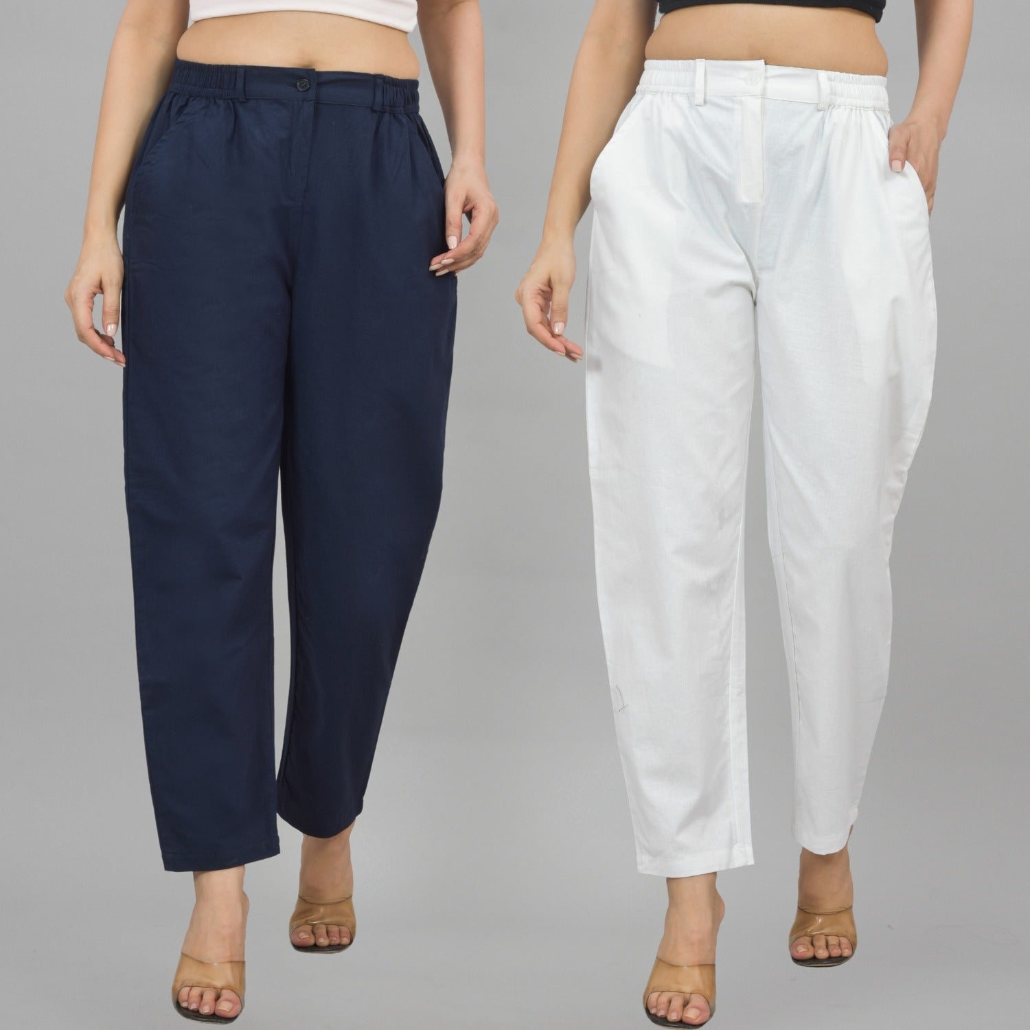 Combo Pack Of 2 Navy Blue And White Womens Cotton Formal Pants