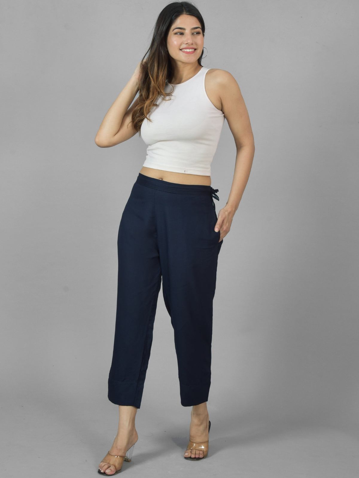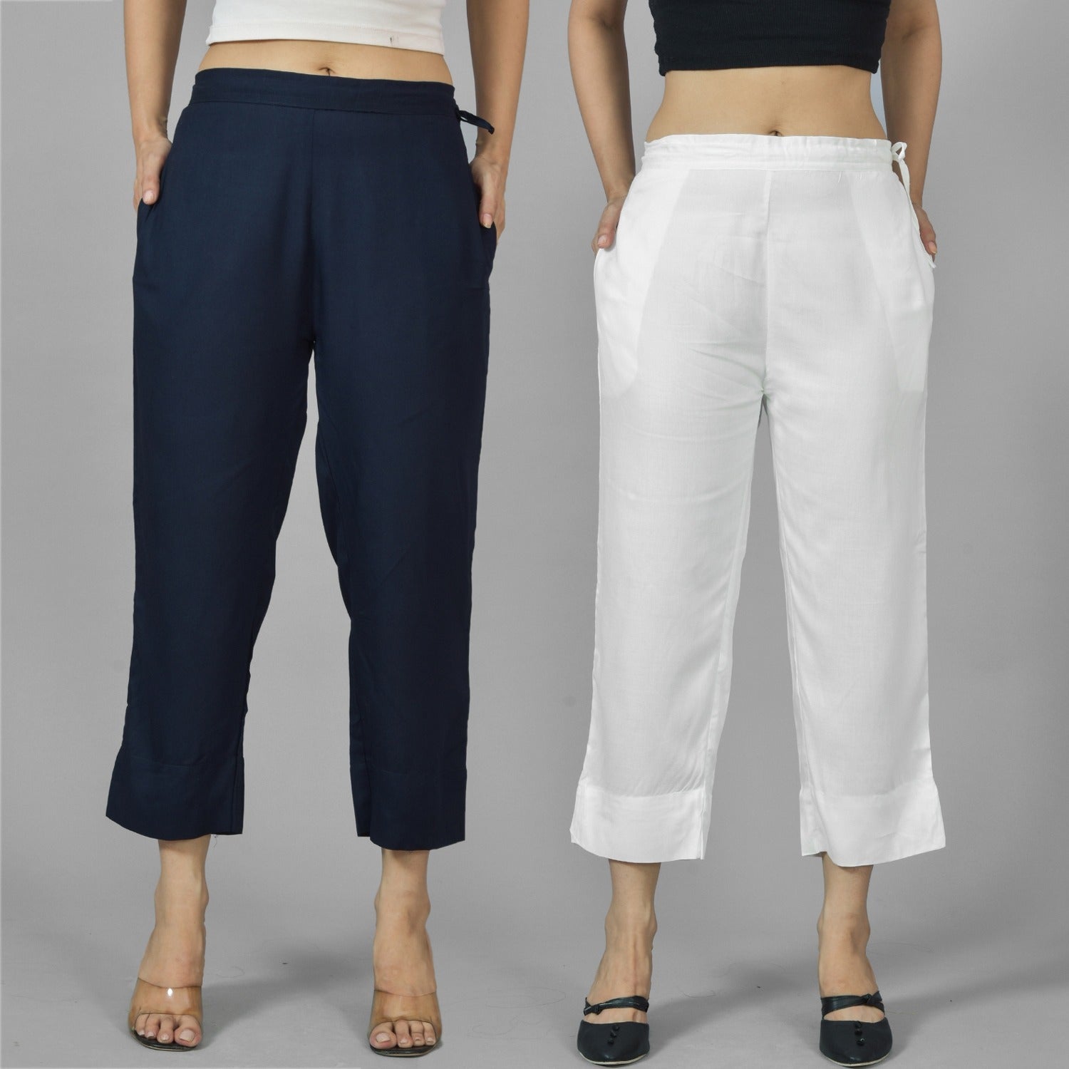 Pack Of 2 Womens Navy Blue And White Ankle Length Rayon Culottes Trouser Combo
