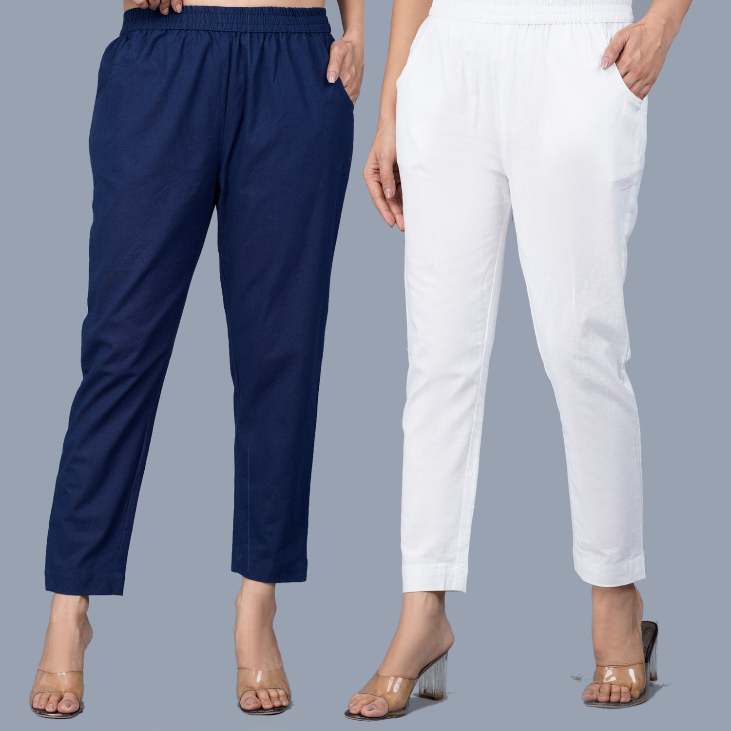 Pack Of 2 Womens Regular Fit Navy Blue And White Fully Elastic Waistband Cotton Trouser