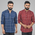 Pack Of 2 Mens Navy Blue And Wine Wide Check Cotton Short Kurta Combo