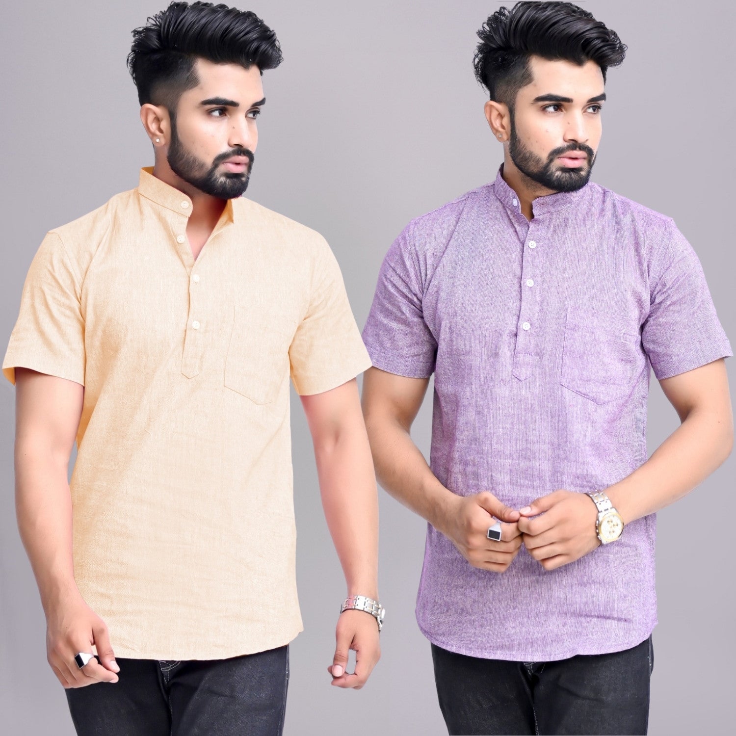 Pack of 2 Mens Solid Off White And Purple Khadi Cotton Short Kurta Combo