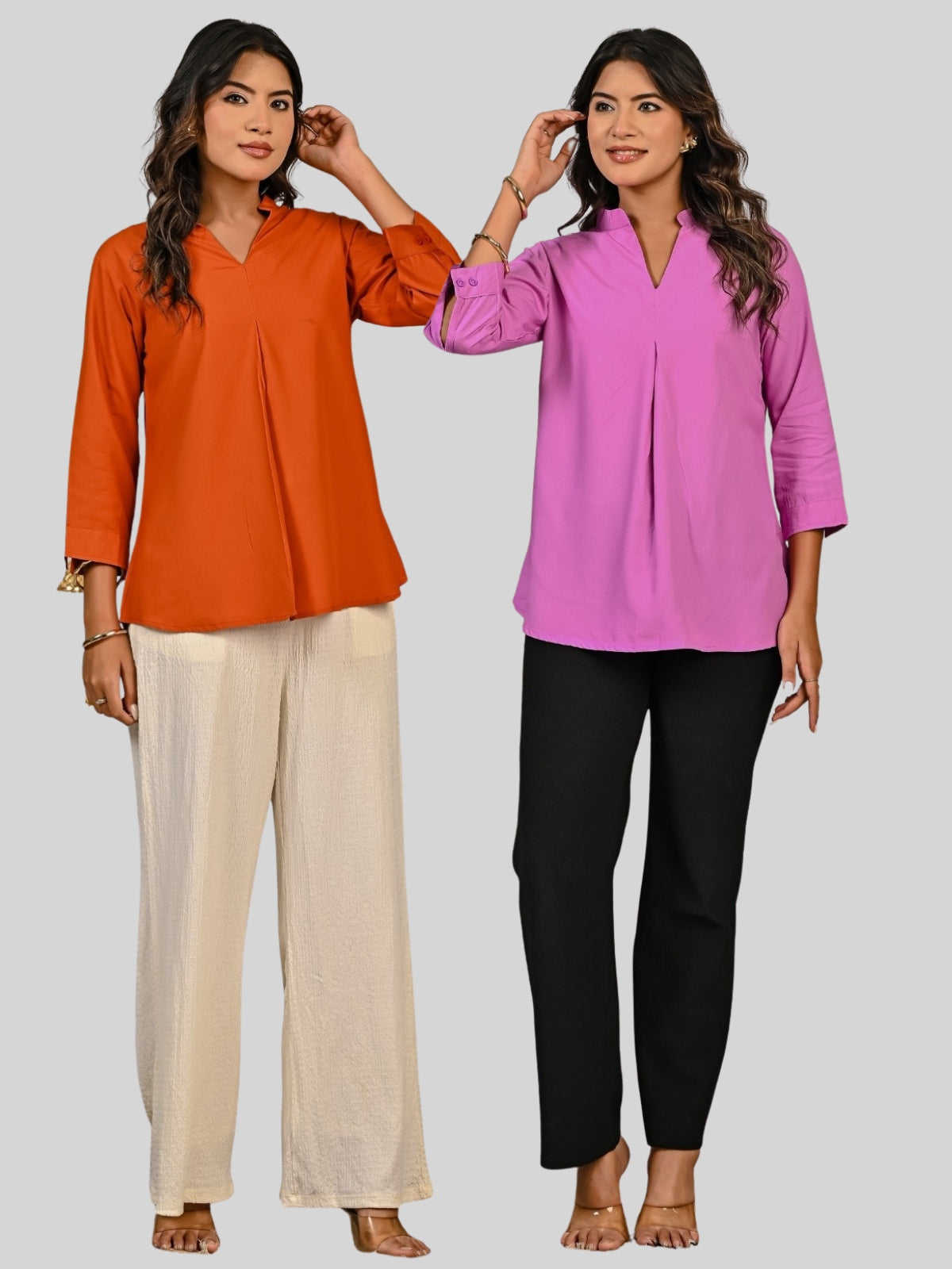 Solid Orange And Purple V Neck Viscose Pleated Tops Combo