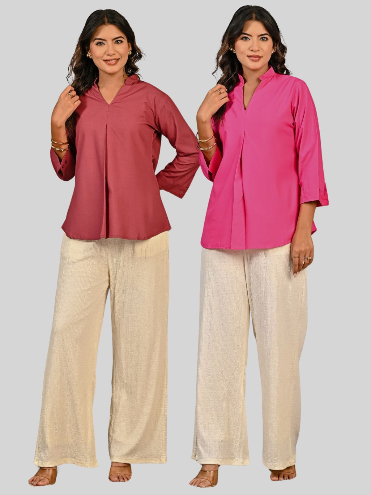 Solid Peach And Pink V Neck Viscose Pleated Tops Combo