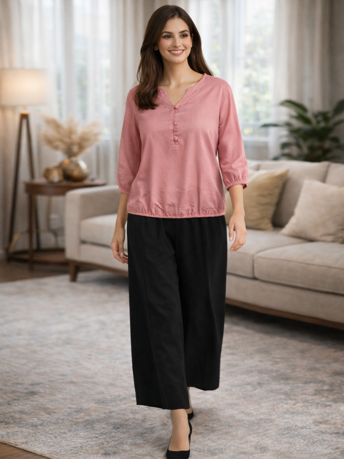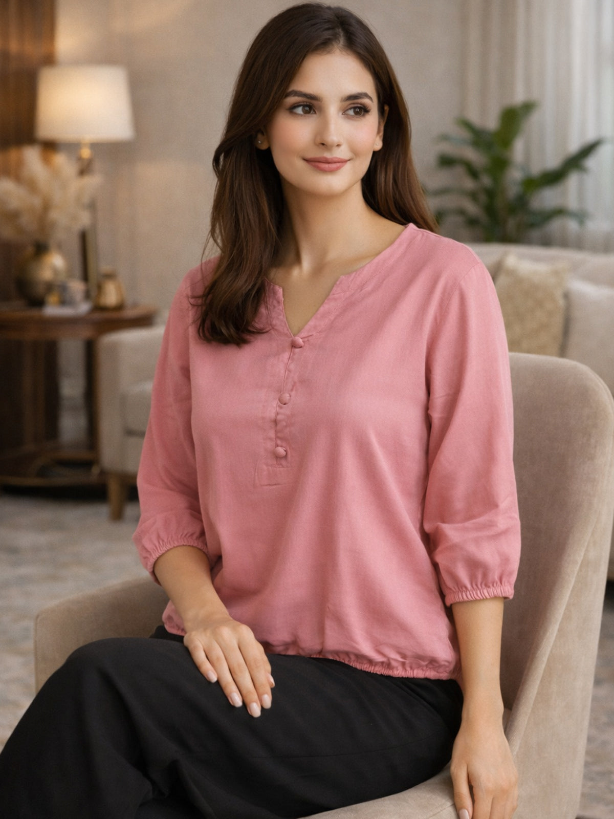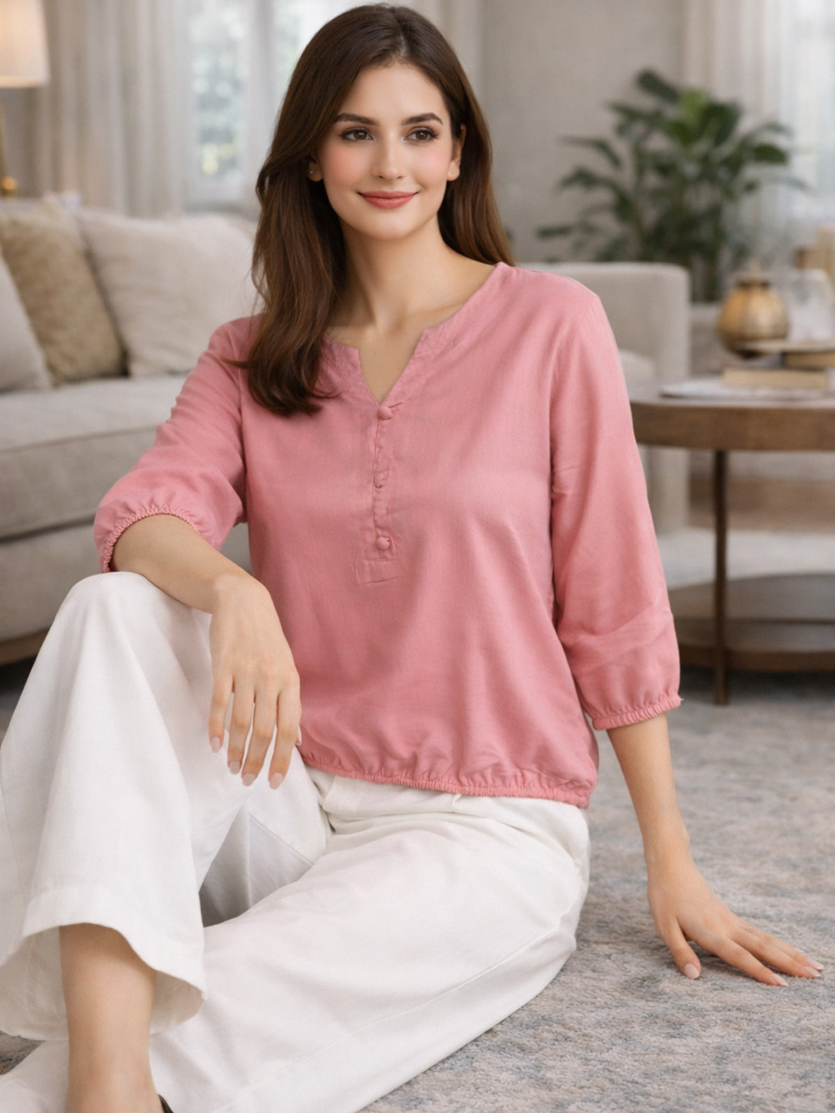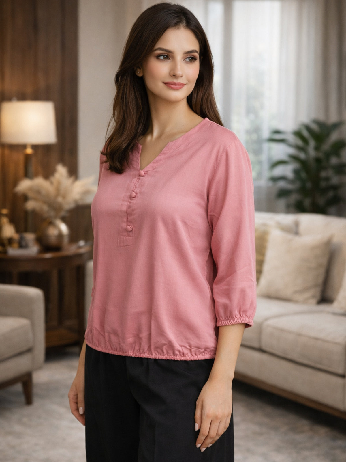 Peach Viscose Elastic Waist Tops