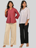 Solid Peach And White V Neck Viscose Pleated Tops Combo