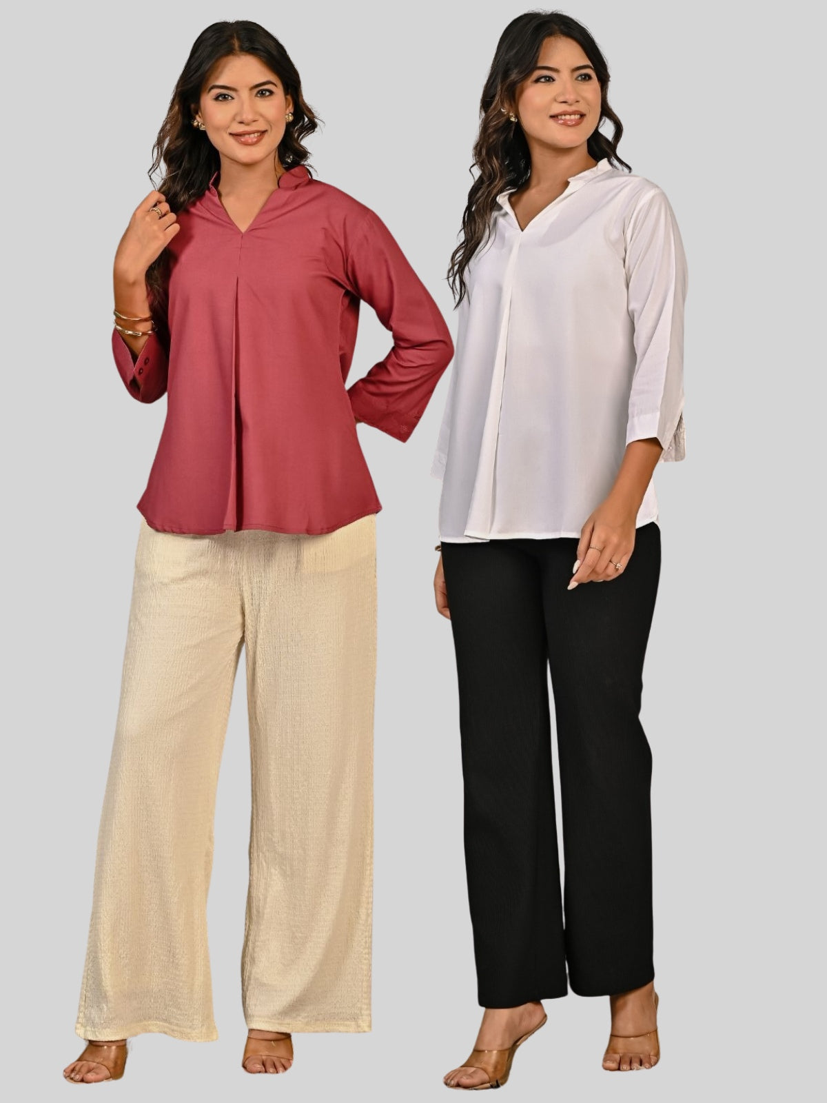 Discover our Solid Viscose V-Neck Collar Pleated Tops for Women, designed to blend comfort with timeless style. Crafted from premium viscose fabric, these chic tops features a flattering V-neck with a mandarin collar, elegant pleated detailing, and versatile 3/4th sleeves for a modern touch. Available in sizes S to 2XL and a wide range of 10 vibrant colors, they ensure the perfect fit for every woman. Ideal for both casual outings and office wear, these stylish tops can be effortlessly paired with jeans, trousers, or skirts for a polished look. Soft, breathable, and easy to style, it’s a wardrobe.
