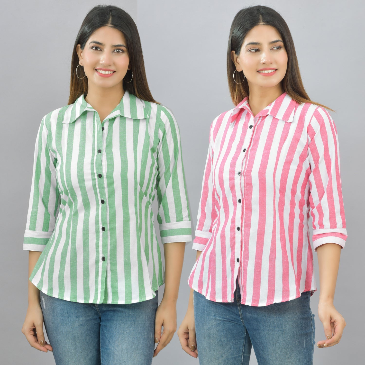 Pack Of 2 Womens Parrot Green And Pink Spread Collar Striped Shirt Combo