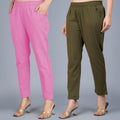 Pack Of 2 Womens Regular Fit Pink And Dark Green Fully Elastic Waistband Cotton Trouser