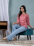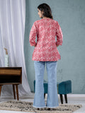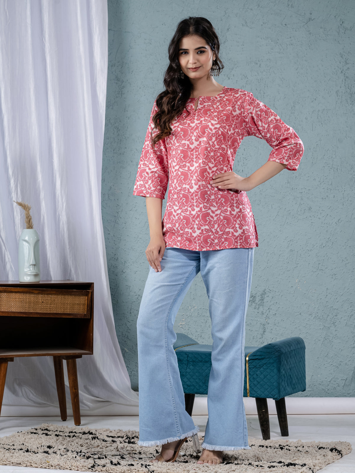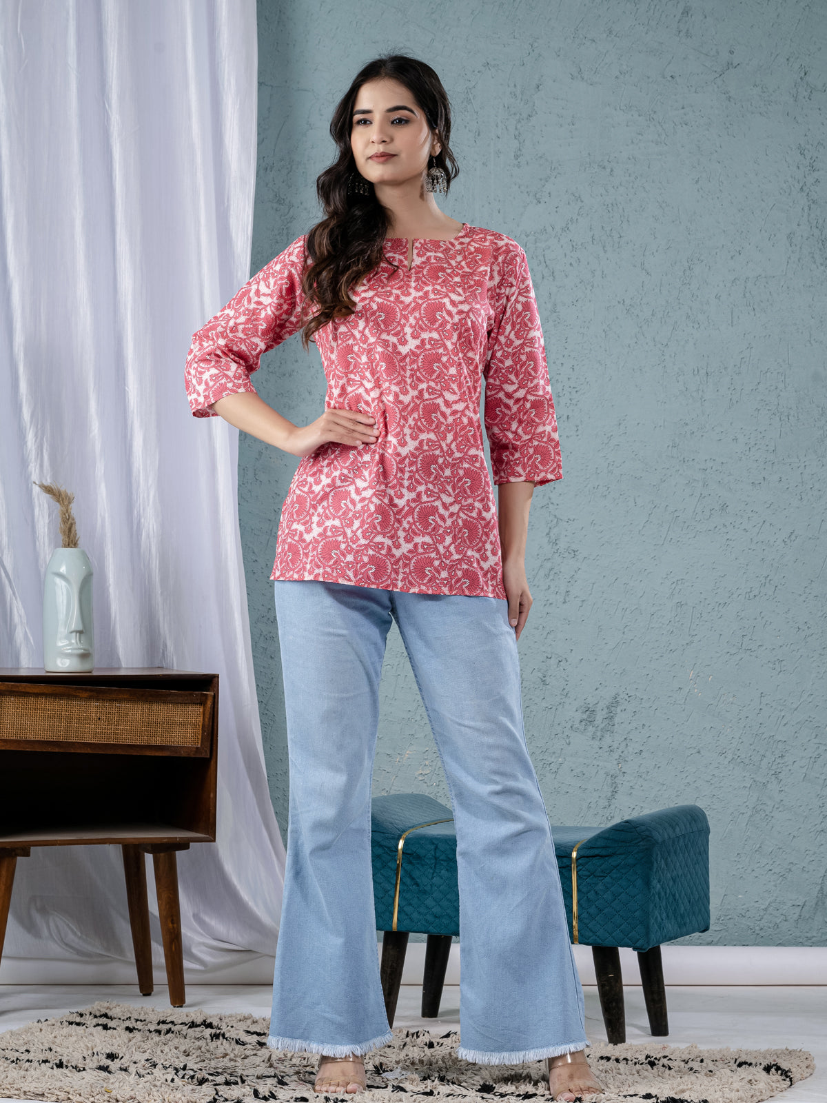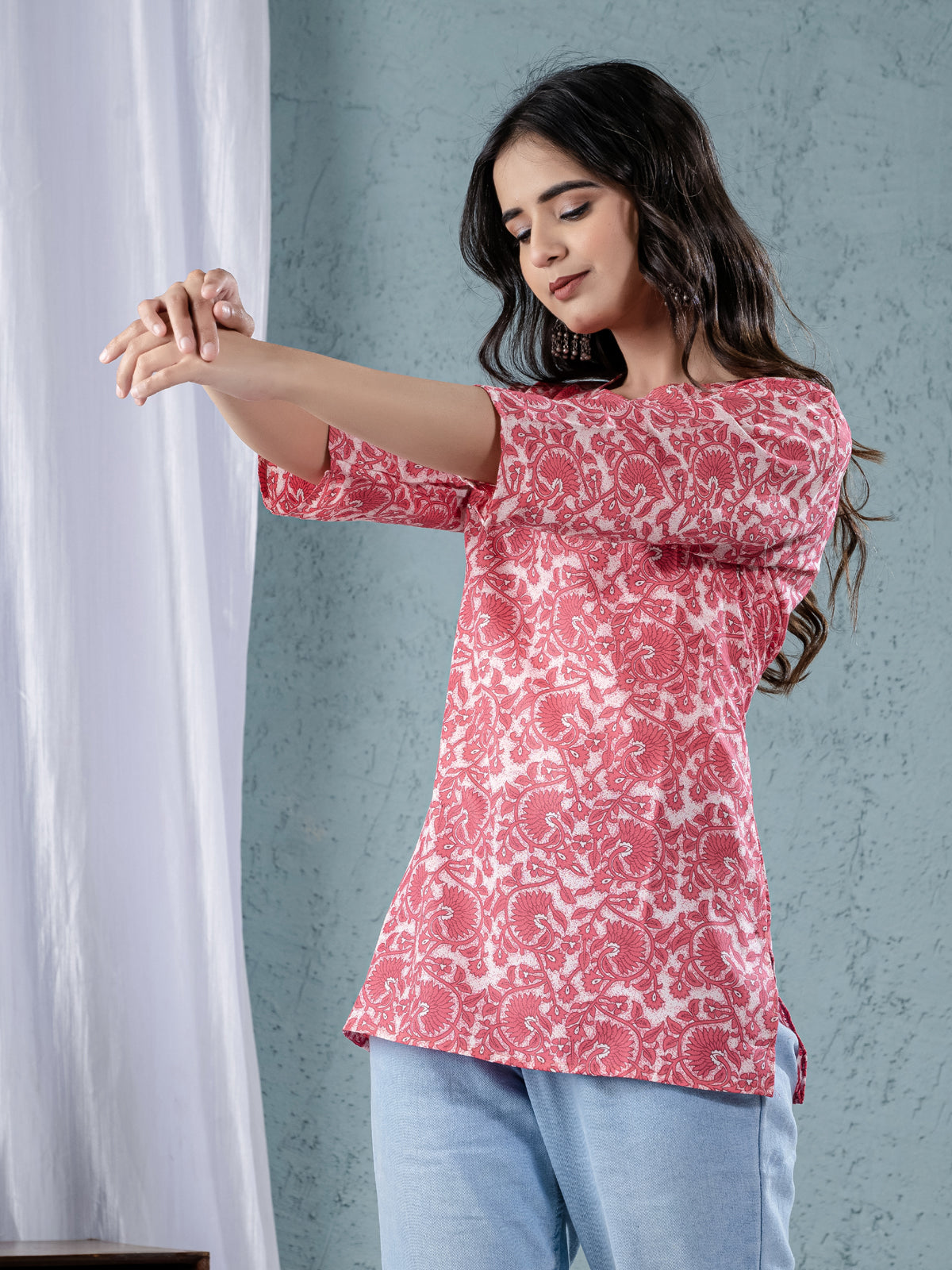 Womens Pink Sanganeri Printed Cotton Short Kurti
