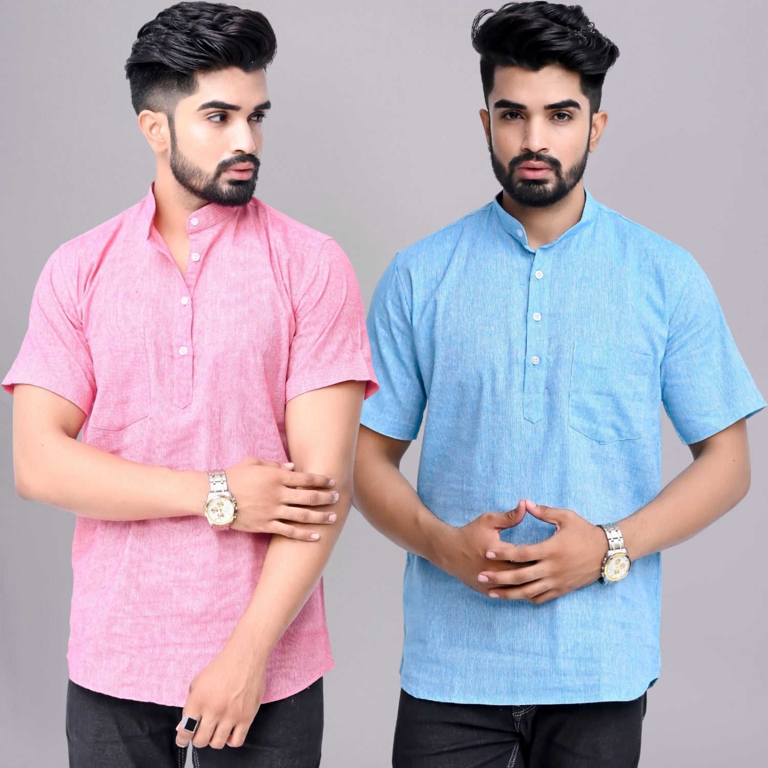 Pack of 2 Mens Solid Pink And Sky Blue Khadi Cotton Short Kurta Combo