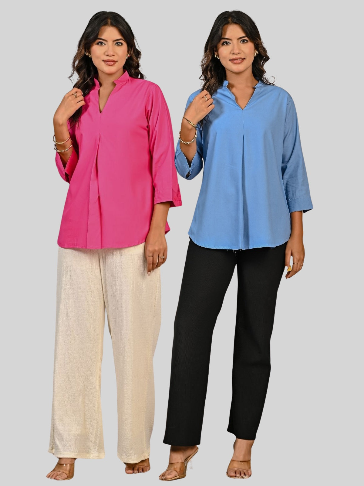 Solid Pink And Sky Blue V Neck Viscose Pleated Tops Combo