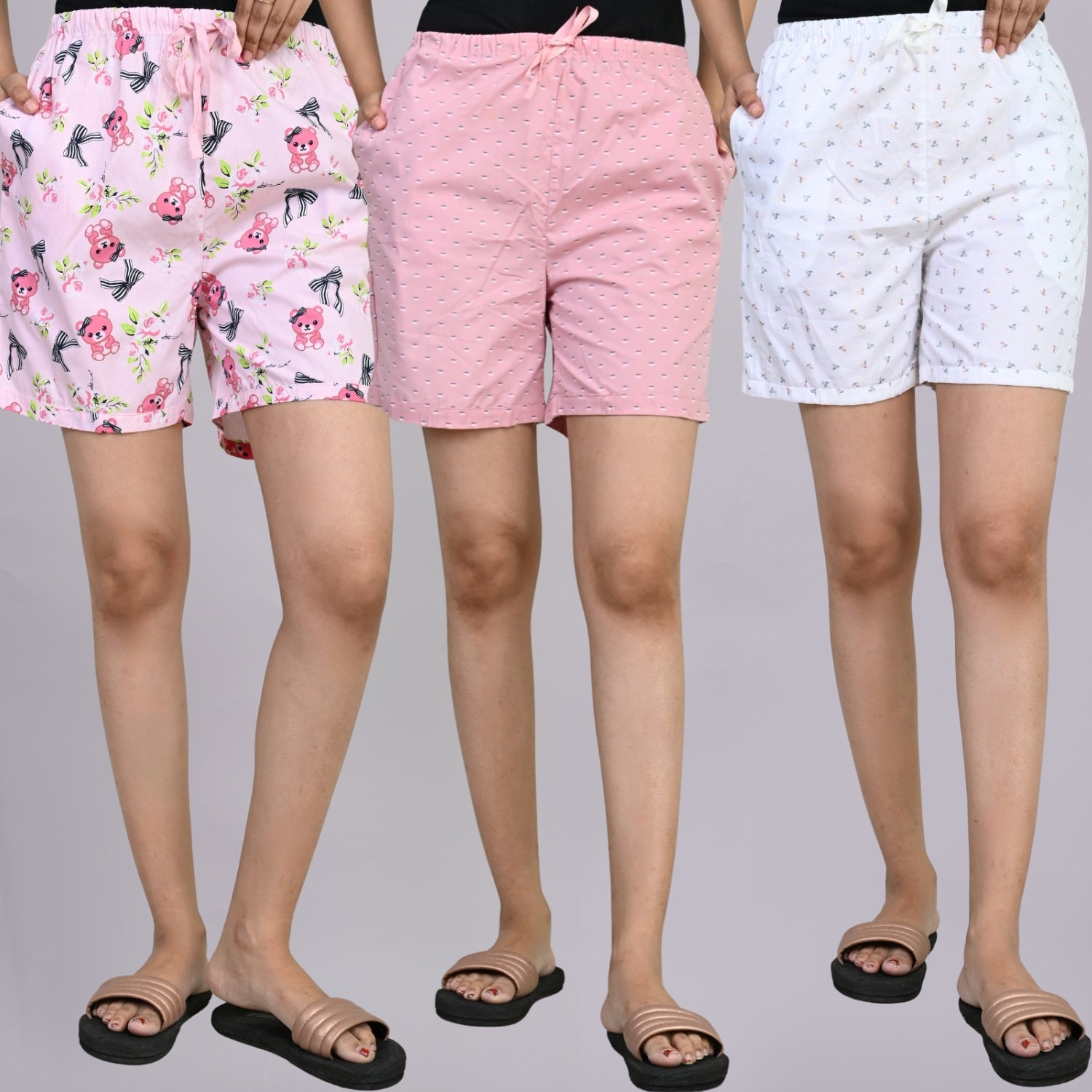 Pack Of 3 Pink Teddy, Pink And White Printed Women Shorts Combo