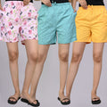 Pack Of 3 Pink Teddy, Sky Blue And Yellow Printed Women Shorts Combo