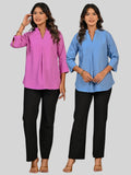 Solid Purple And Sky Blue V Neck Viscose Pleated Tops Combo