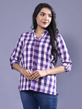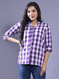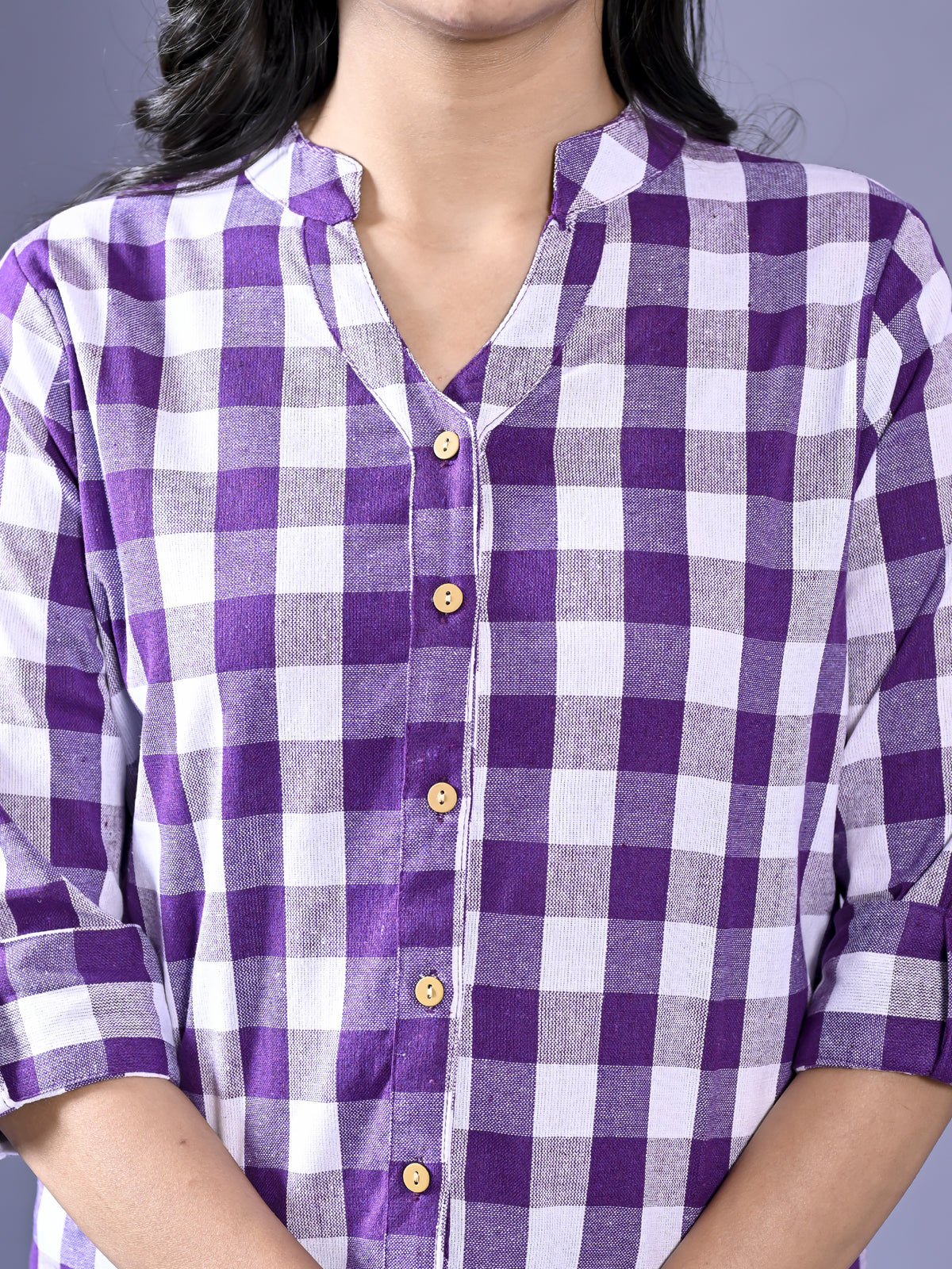 Women Regular Fit Purple Checkered Mandarin Collar Casual Shirt