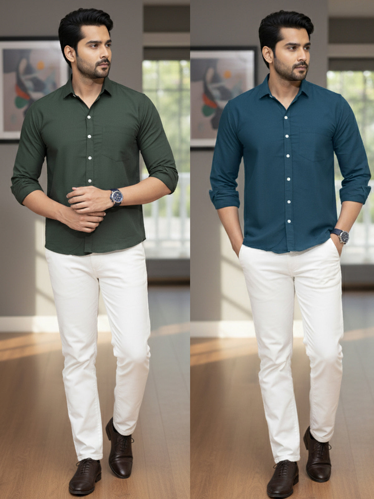 These stylish men's Airy linen shirts Combo with a solid color design will give your outfit a timeless, sophisticated touch. This full-sleeve shirt is perfect for both formal and casual settings because of its durability and all-day comfort. The spread collar adds a sophisticated touch, and the button closure ensures a neat fit. Made from a high-quality linen fabric, this shirt's soft feel and breathability make it ideal for year-round wear. Wear it with pants for a polished office look or jeans for a laid-back weekend outing. This multipurpose shirt is a wardrobe essential for the modern man and is available in a variety of sizes.
