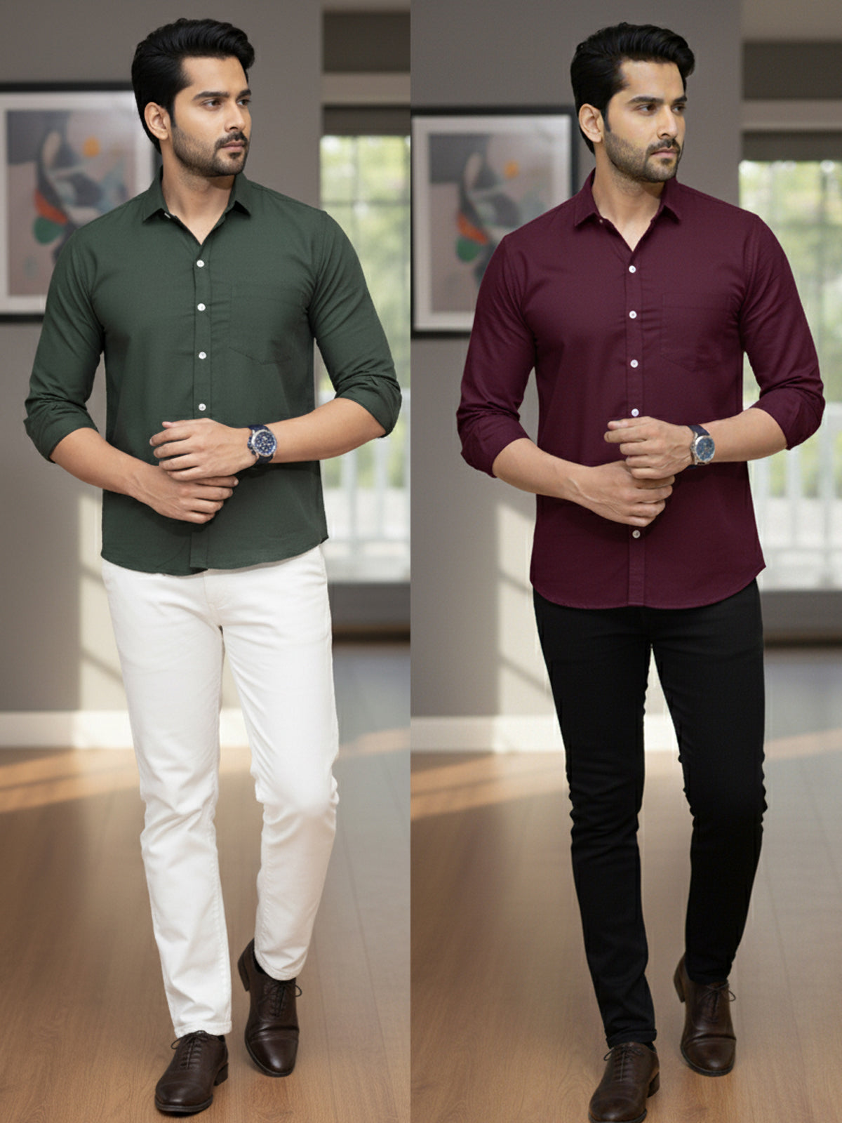 These stylish men's Airy linen shirts Combo with a solid color design will give your outfit a timeless, sophisticated touch. This full-sleeve shirt is perfect for both formal and casual settings because of its durability and all-day comfort. The spread collar adds a sophisticated touch, and the button closure ensures a neat fit. Made from a high-quality linen fabric, this shirt's soft feel and breathability make it ideal for year-round wear. Wear it with pants for a polished office look or jeans for a laid-back weekend outing. This multipurpose shirt is a wardrobe essential for the modern man and is available in a variety of sizes.
