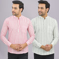 Pack Of 2 Mens Pink And Light Grey Stripe Linen Slub Short Kurta