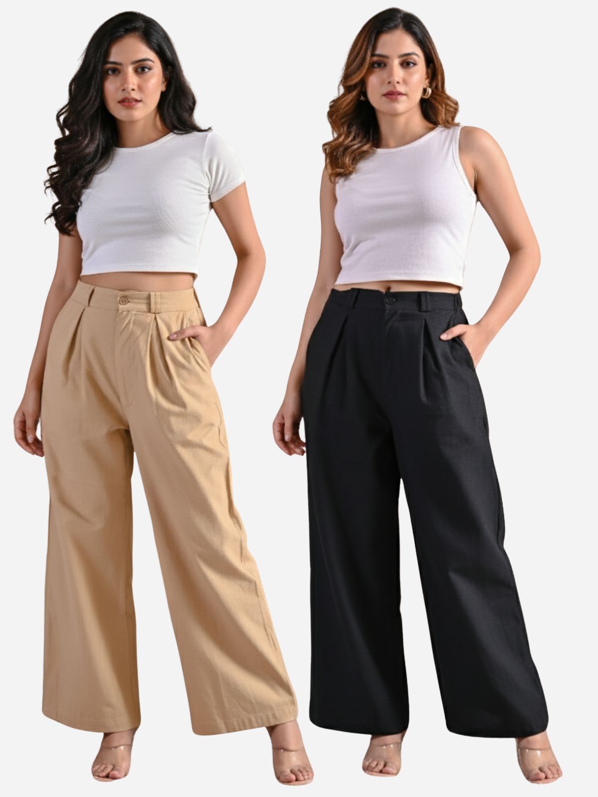 Pack Of 2 Beige And Black Women Cotton Wide Leg Pants