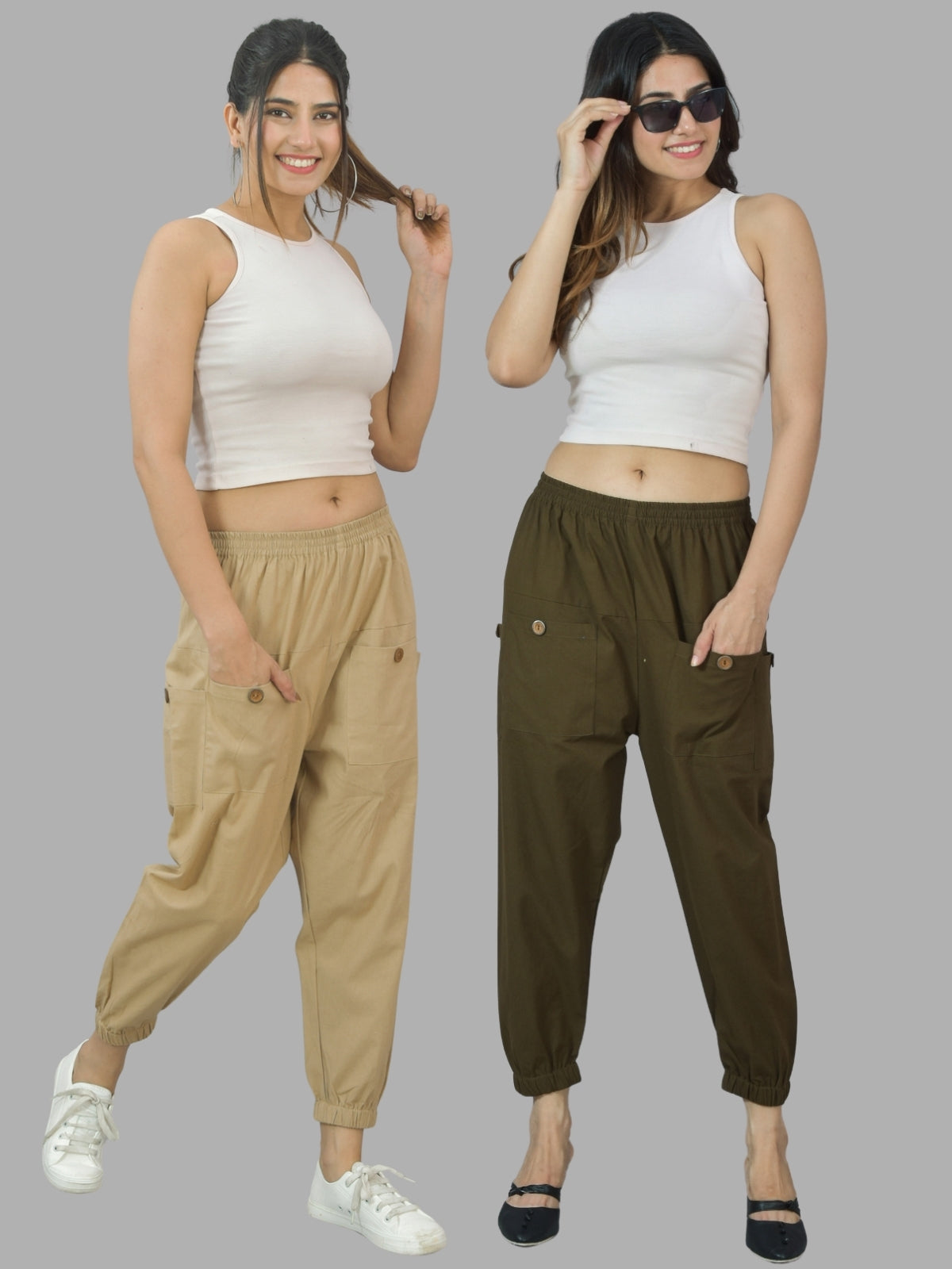 Combo Pack Of Womens Beige And Dark Green Four Pocket Cotton Cargo Pants