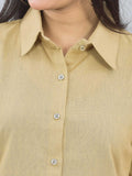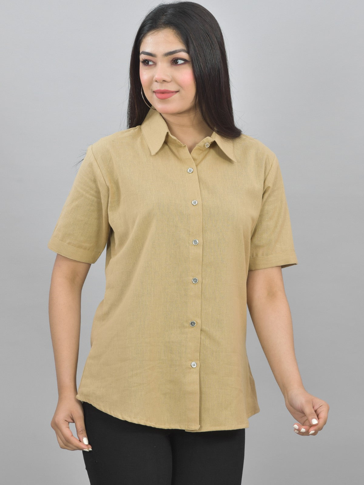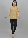 Women Solid Beige Half Sleeve Spread Collar Cotton Shirt