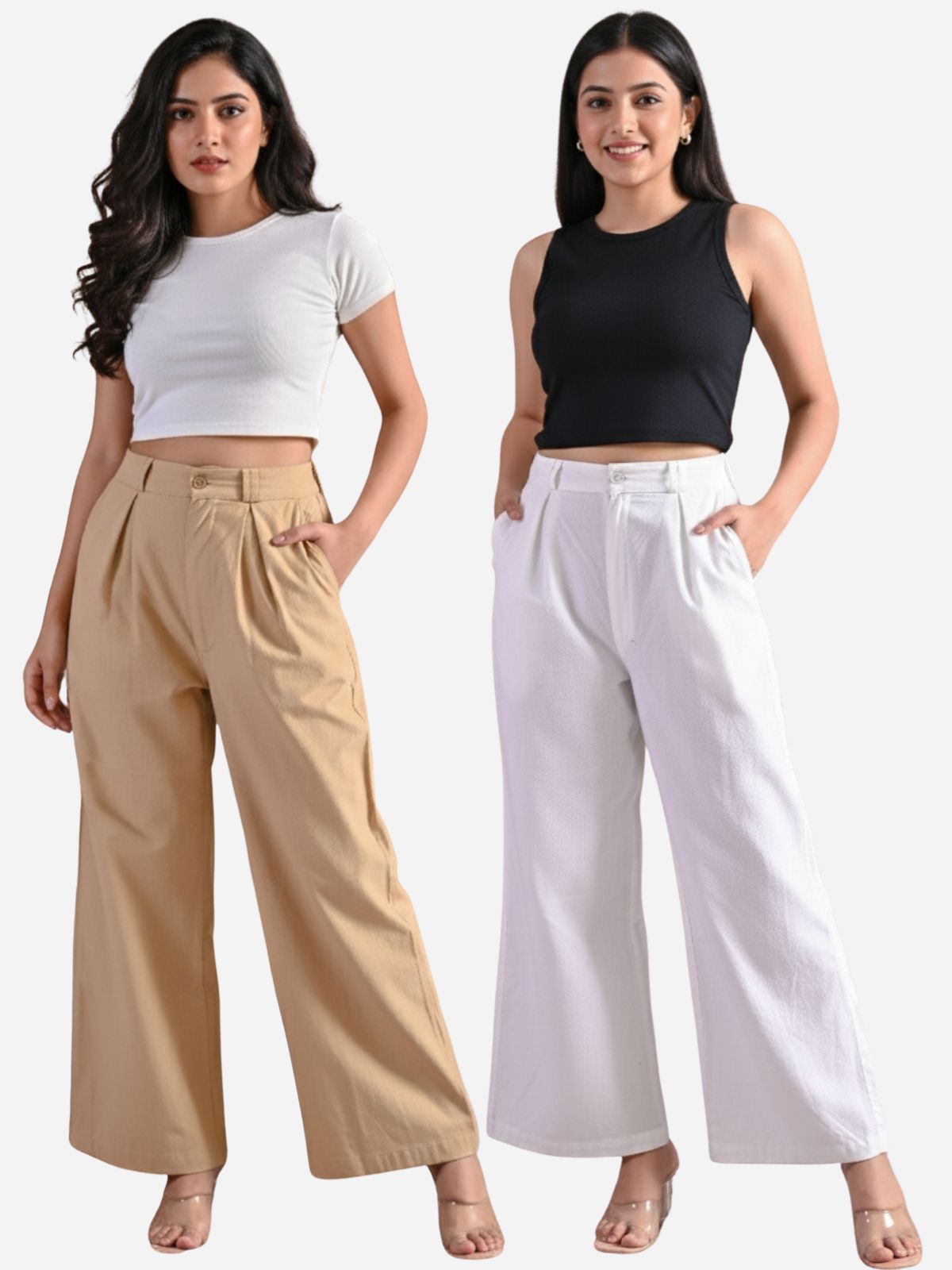 Pack Of 2 Beige And White Women Cotton Wide Leg Pants