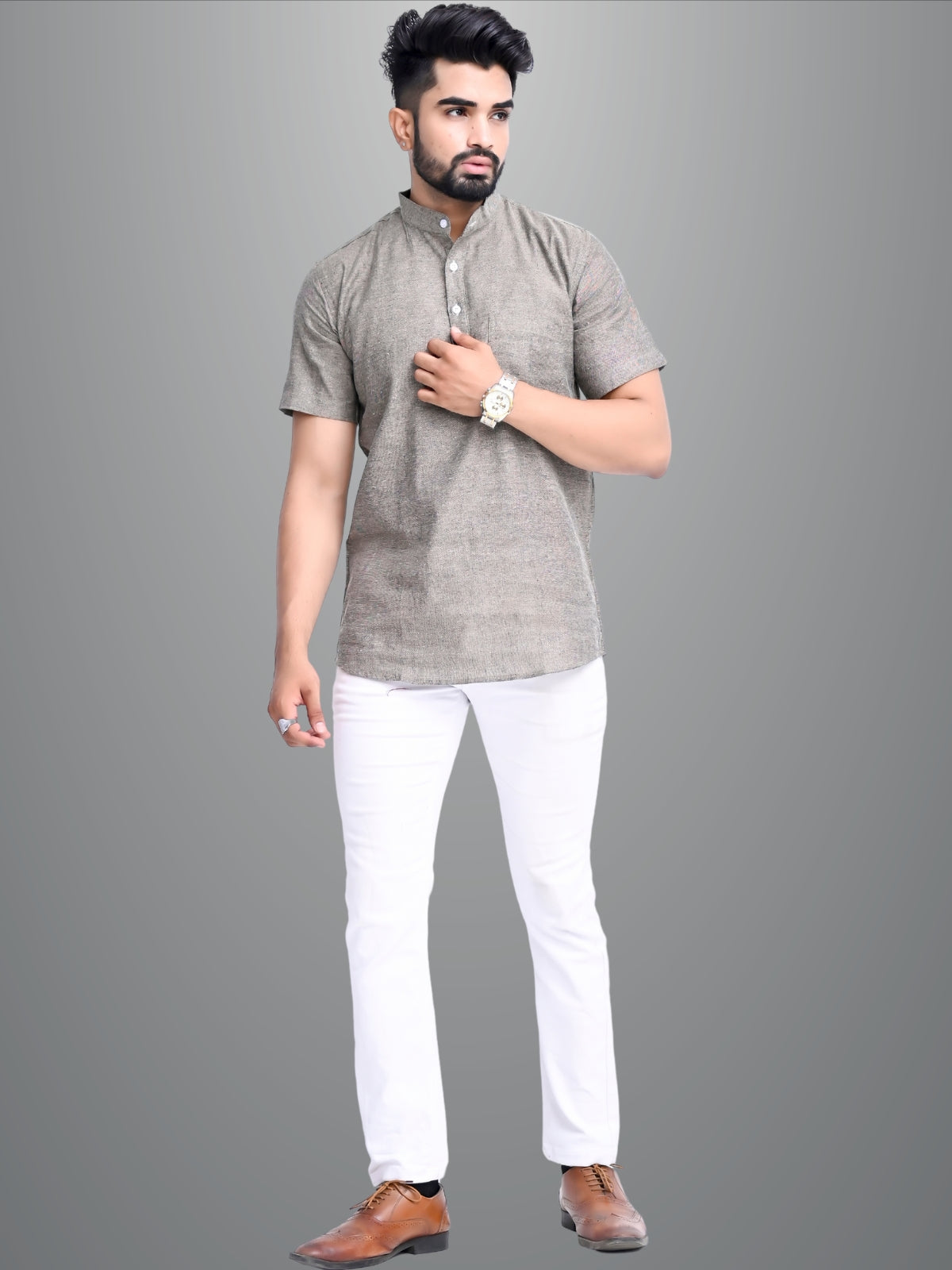 Mens Regular Fit Biscuit Grey and Dark Blue Half Sleeve Cotton Short Kurta Combo