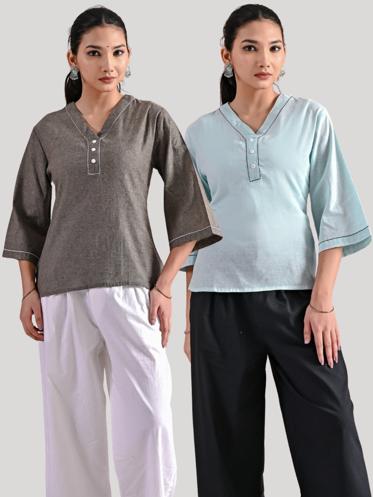 Pack Of 2 Biscuit And Ice Blue Handloom Cotton Anchor Thread Designer Tops
