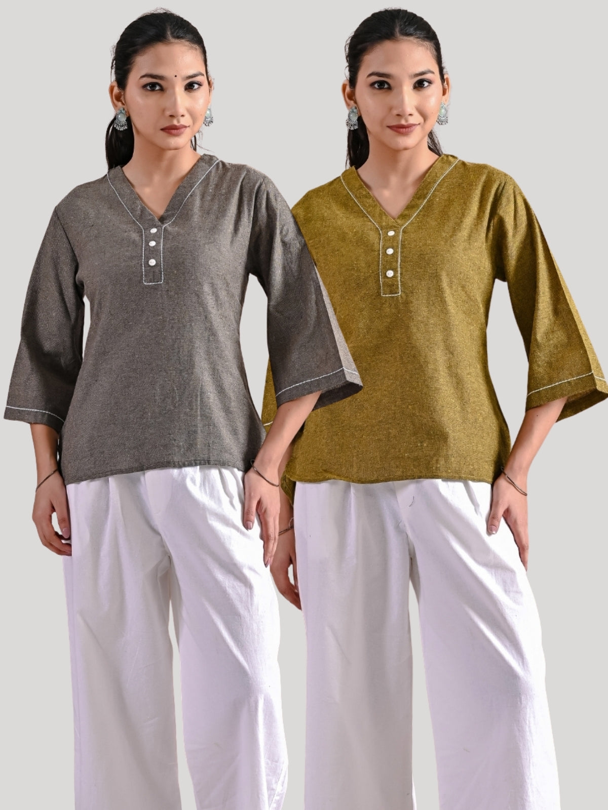Pack Of 2 Biscuit And Mustard Handloom Cotton Anchor Thread Designer Tops